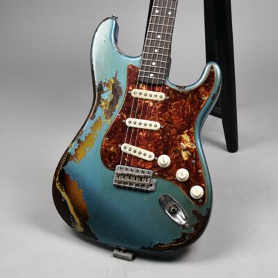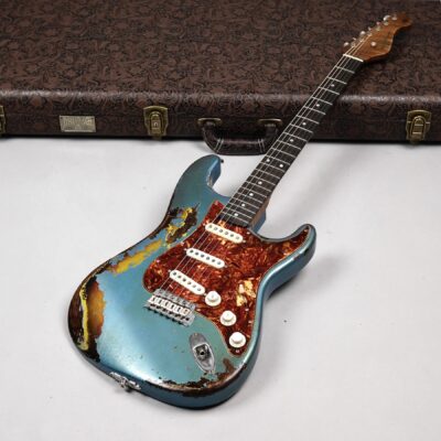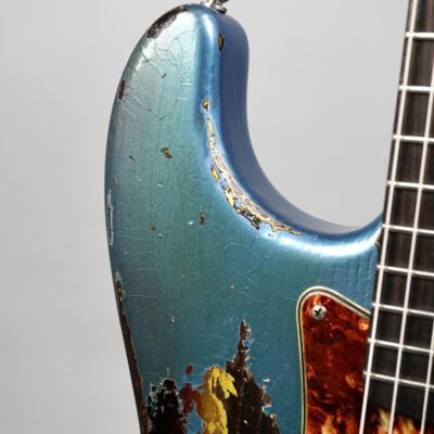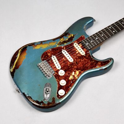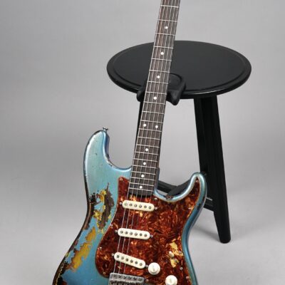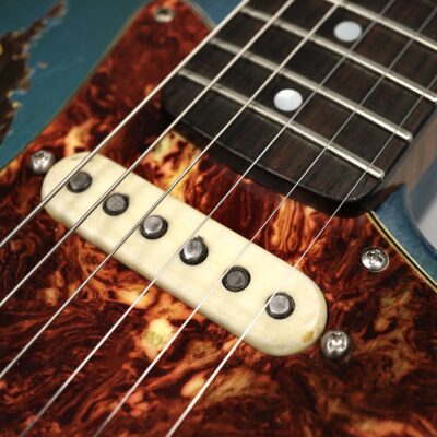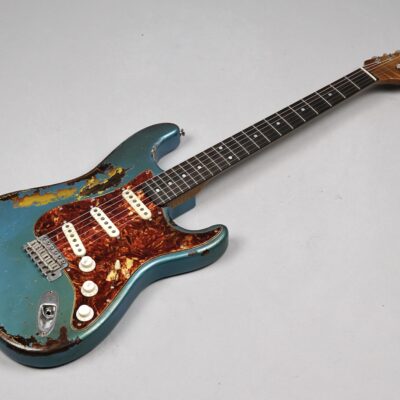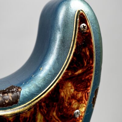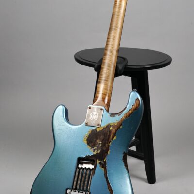Kian präsentiert sich nach Jahren enger Zusammenarbeit mit Nick als vollendeter Meister seines Fachs: Die „Lake Placid Blue over Sunburst“-Lackierung kommt mit heftigen, bis auf’s Holz gehenden Alterungs- bzw. Abriebspuren und zahlreichen Dings & Dongs daher. Selbst die Pick Ups und Volumen/Tone-Regler zeigen jede Menge Patina. Das ist Aging at its best – meisterlich mit viel Know-How und einem Auge für’s Detail gemacht!