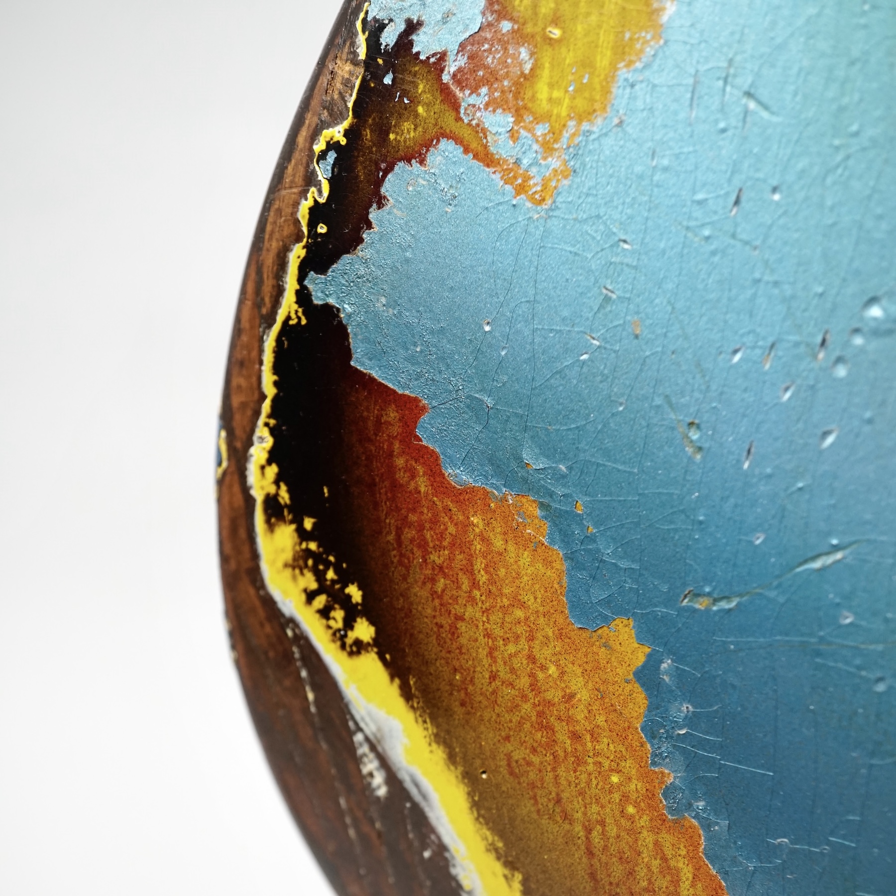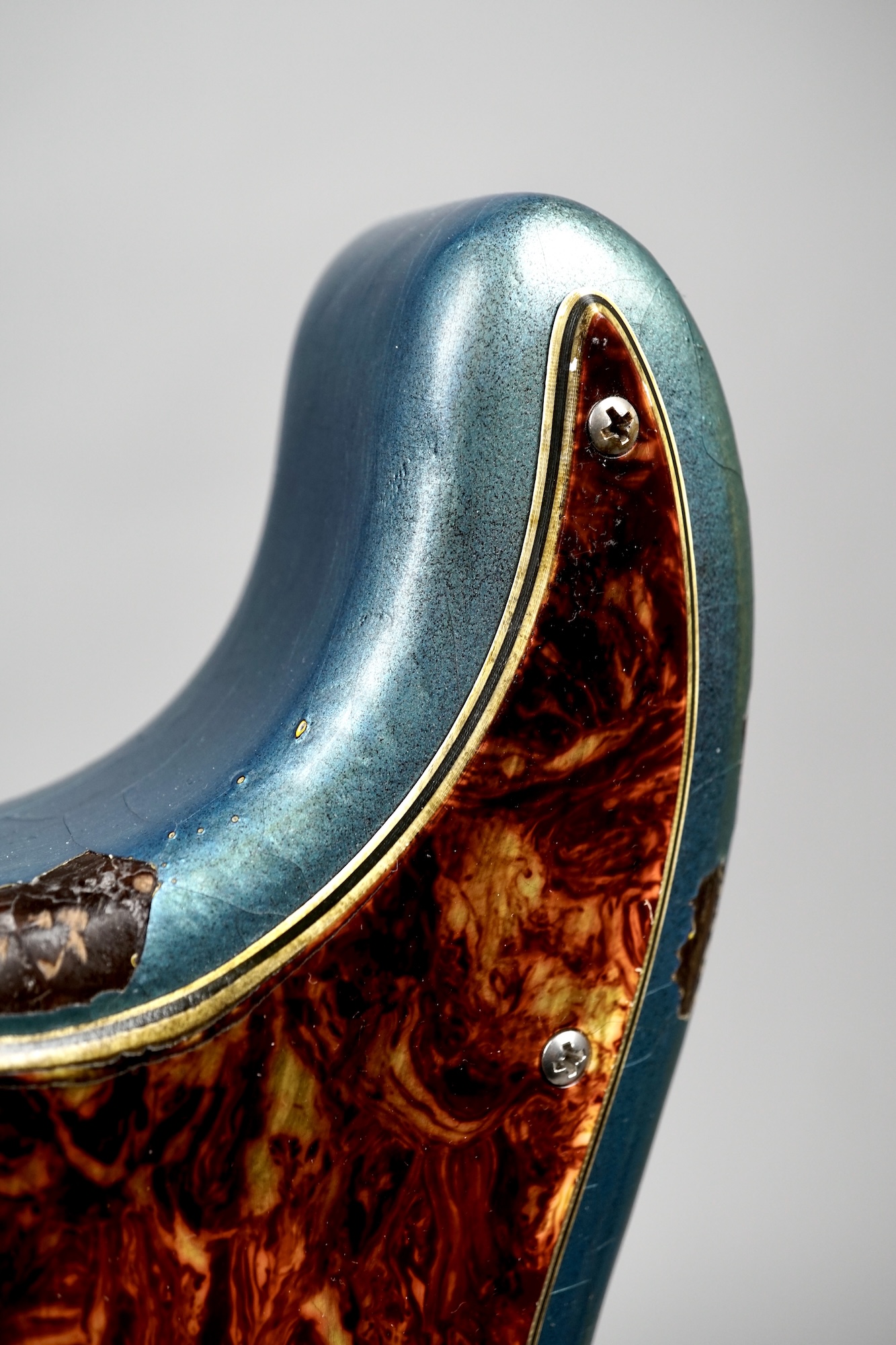 Kian präsentiert sich nach Jahren enger Zusammenarbeit mit Nick als vollendeter Meister seines Fachs: Die „Lake Placid Blue over Sunburst“-Lackierung kommt mit heftigen, bis auf’s Holz gehenden Alterungs- bzw. Abriebspuren und zahlreichen Dings & Dongs daher. Selbst die Pick Ups und Volumen/Tone-Regler zeigen jede Menge Patina. Das ist Aging at its best – meisterlich mit viel Know-How und einem Auge für’s Detail gemacht!