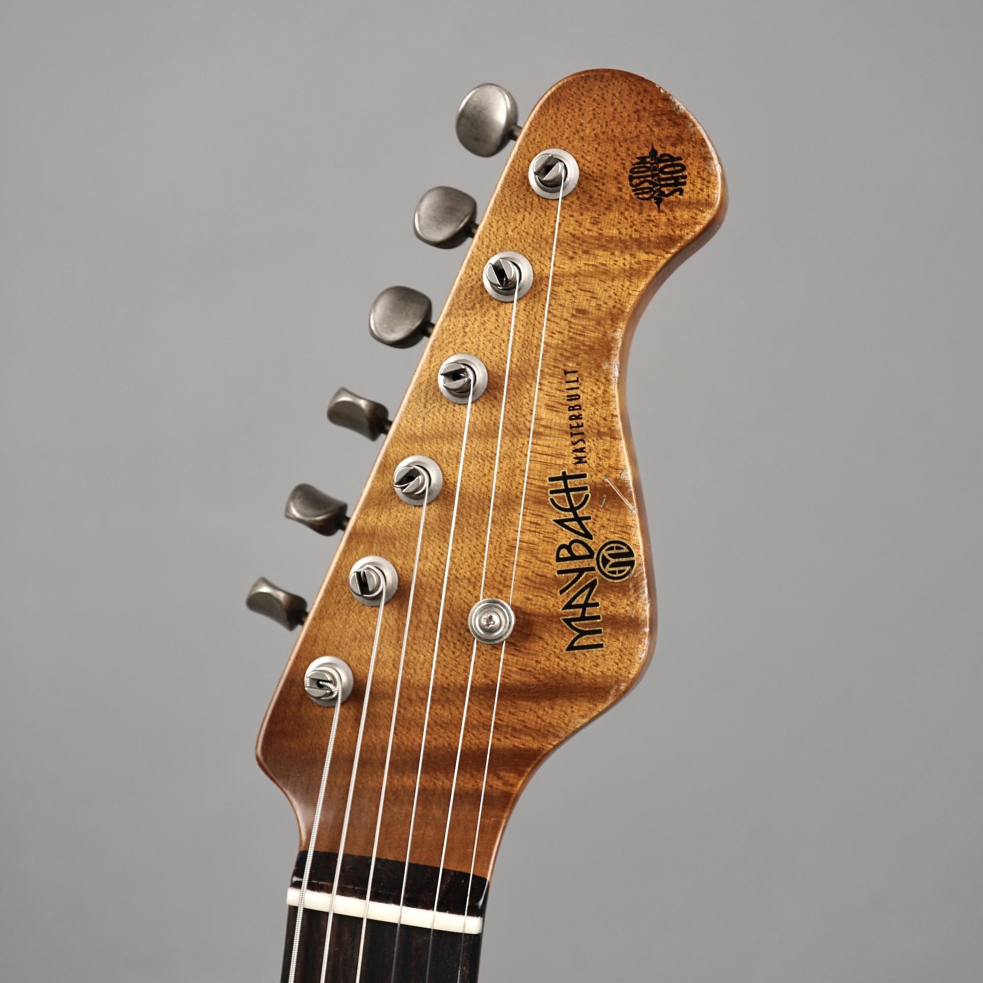 Ausgewählte Esche für den Korpus, ein geflammter – durch’s Roasting schön dunkel gefärbter – Ahorn-Hals und ein klassisches Griffbrett aus Rosewood – und auch die sonstigen Komponenten (s.u.) dieser Maybach sind vom Feinsten!