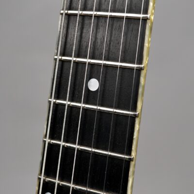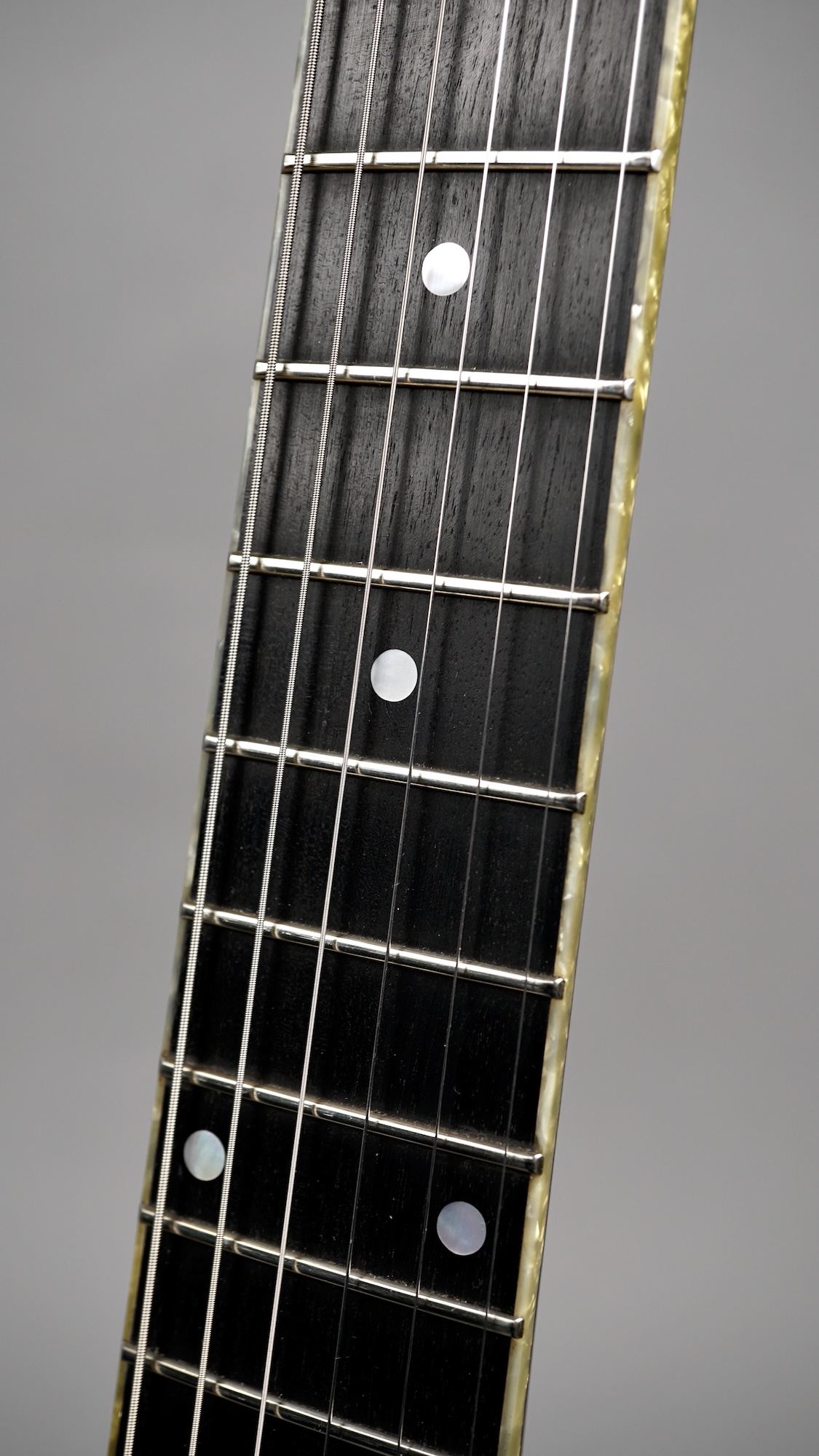 Hierzu passend ist der Hals mit dem dunklen Ebony-Griffbrett von einem hinreissend gealterten Vintage Pearl Celluloid-Binding eingefasst. Das hochwertige Red Tortoise Celluloid-Pickguard setzt den farblichen Kontrapunkt zur Lackierung.