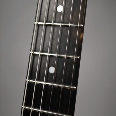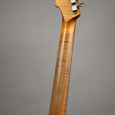 Der Hals aus geflammten Maple wurde getinted und mit einem Ebony-Griffbrett veredelt. Das „Sweet V“ Neck Shape bezeichnet ein sorgsam austariertes Handschmeichler-Profil, welches in Kombination mit dem hauchdünnen, polierten Nitro-Finish und dem Compound Radius (10″ auf 14″) für eine hervorragende Bespielbarkeit sorgt. Erwähnenswert in diesem Zusammenhang ist bei diesem Exemplar auch die ergonomisch perfekte Abschrägung des Bodys an der relevanten Ecke am Hals-Korpusübergang, die dem Spieler das Solieren in höheren Lagen erleichtert.