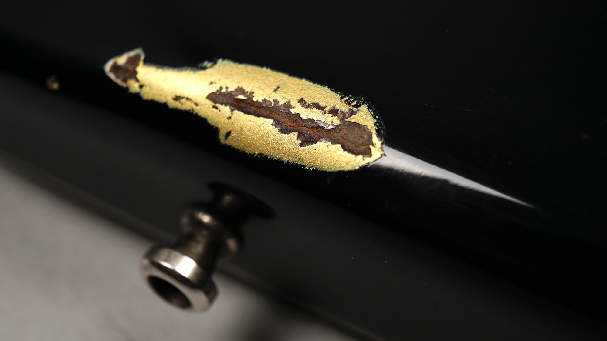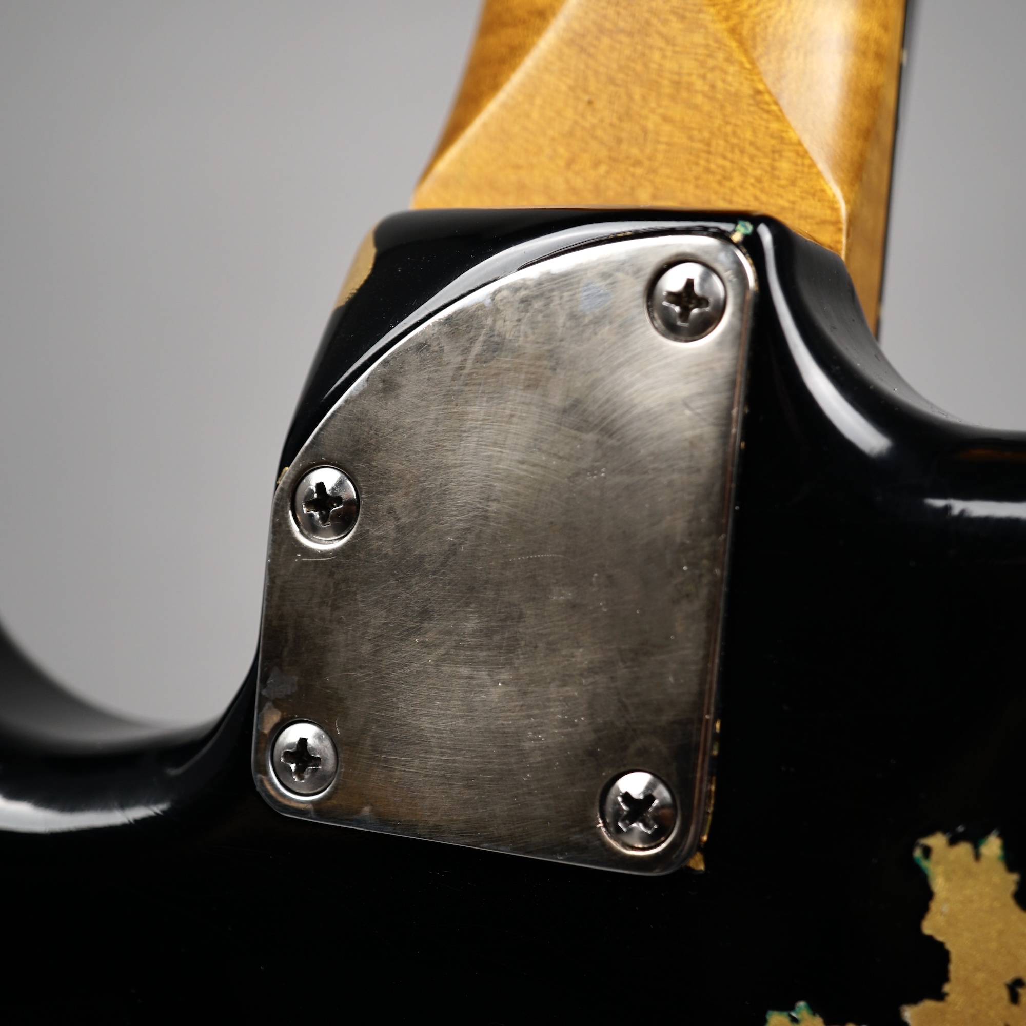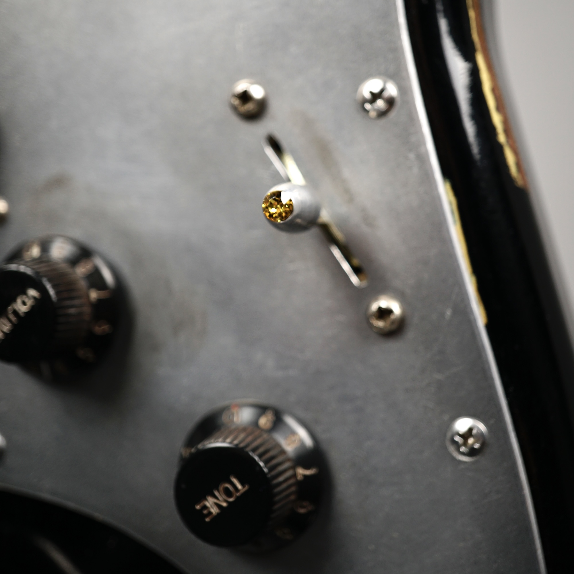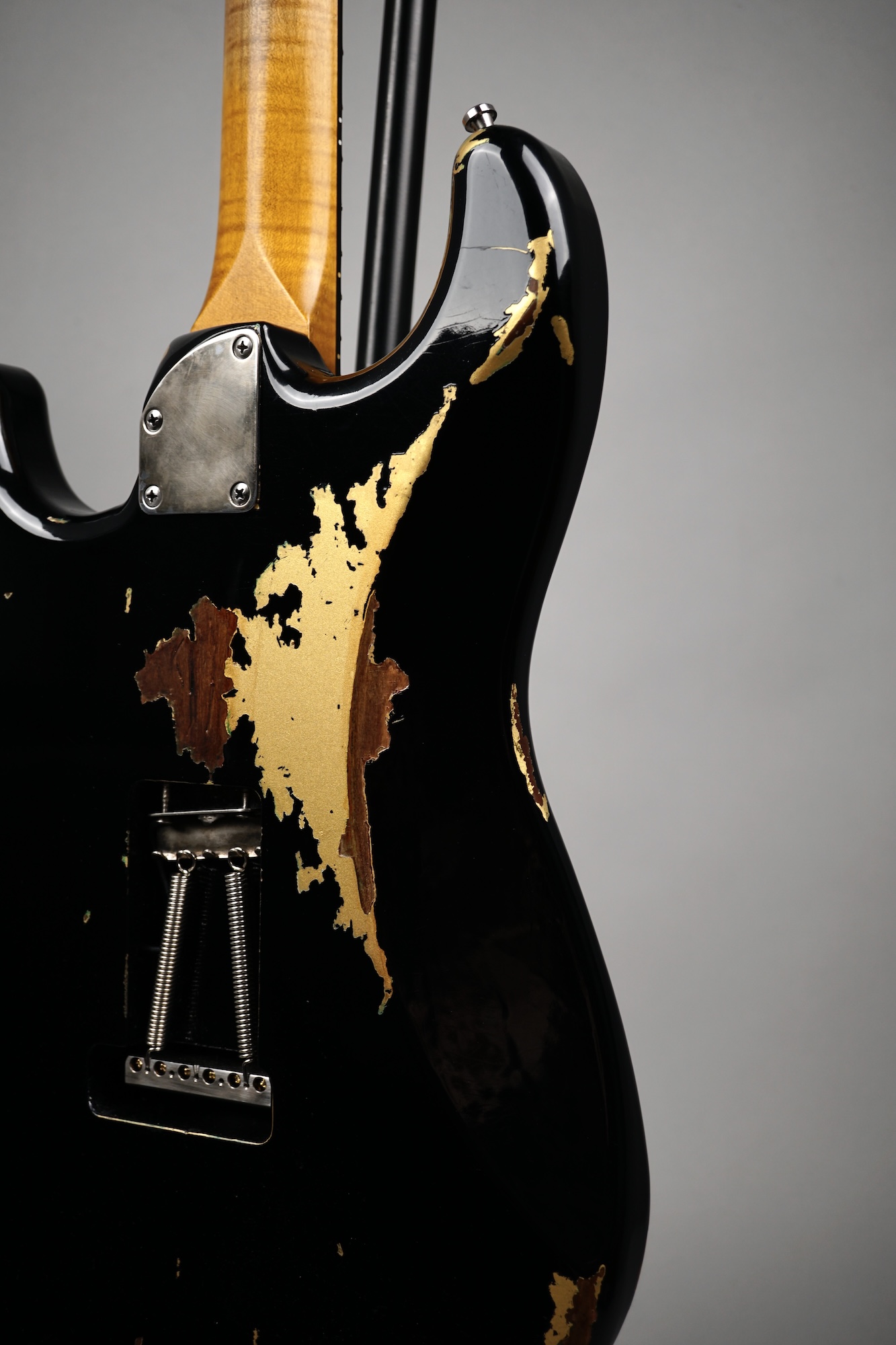 Dieses Salinger-Modell ist ebenfalls Teil der „Gold Rush“-Edition, wobei hier die Gold-Lackierung lediglich das Fundament bildet, welches dann mit einem tiefschwarzen Nitro-Finish überlackiert wurde. Hiernach wurden dem Body gekonnt die Spielspuren eines langjährigen Bühneneinsatzes – zum Teil sogar bis auf’s pure Erlenholz- beigebracht.
