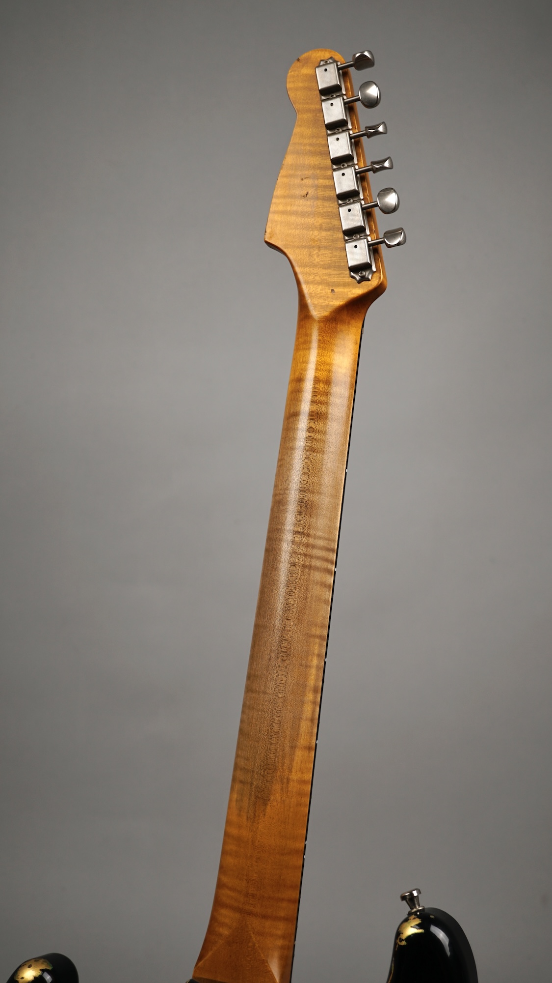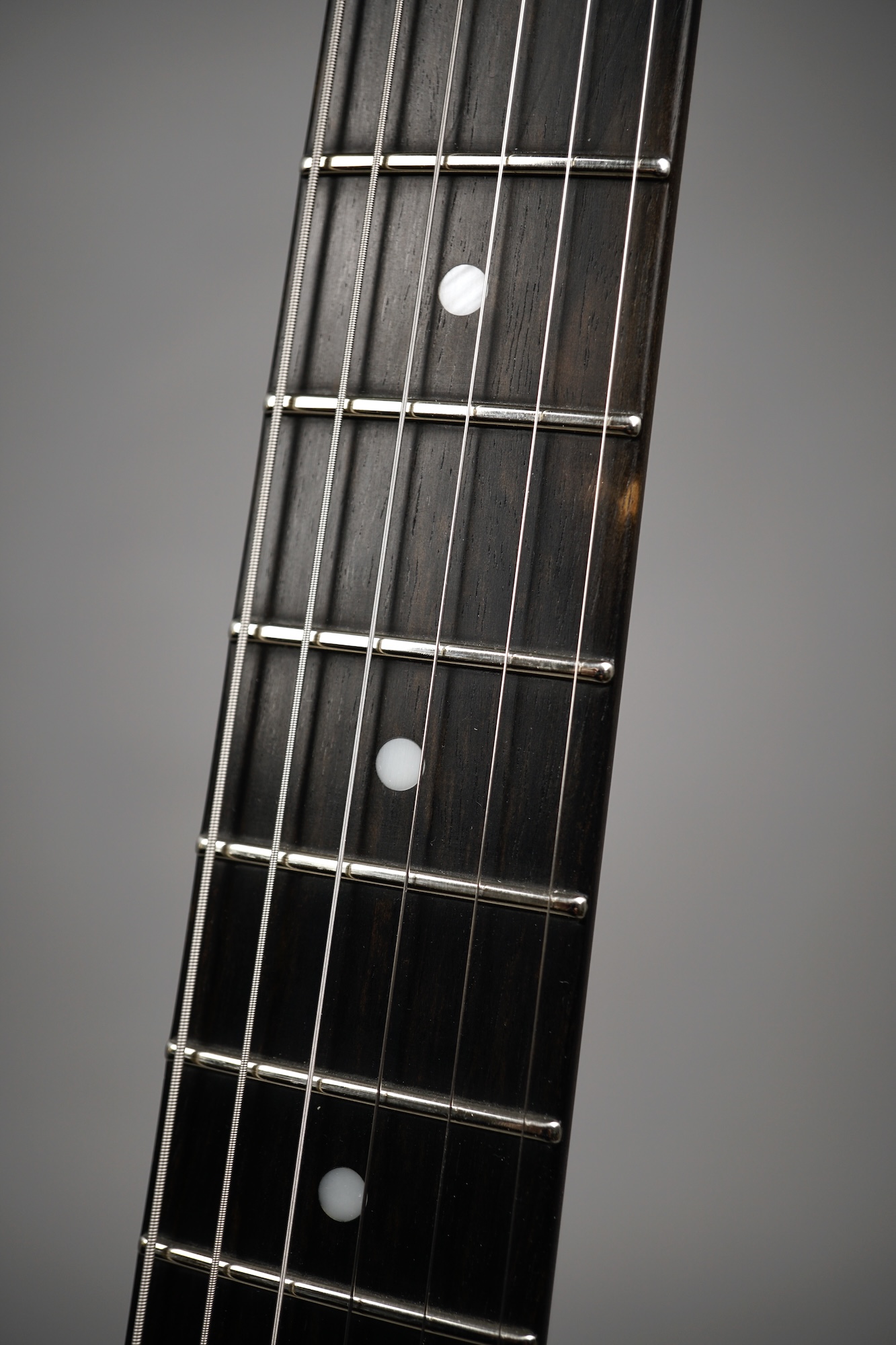 Der Hals aus geflammten Maple wurde getinted und mit einem Ebony-Griffbrett veredelt. Das „Sweet V“ Neck Shape bezeichnet ein sorgsam austariertes Handschmeichler-Profil, welches in Kombination mit dem hauchdünnen, polierten Nitro-Finish und dem Compound Radius (10″ auf 14″) für eine hervorragende Bespielbarkeit sorgt. Erwähnenswert in diesem Zusammenhang ist bei diesem Exemplar auch die ergonomisch perfekte Abschrägung des Bodys an der relevanten Ecke am Hals-Korpusübergang, die dem Spieler das Solieren in höheren Lagen erleichtert.