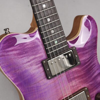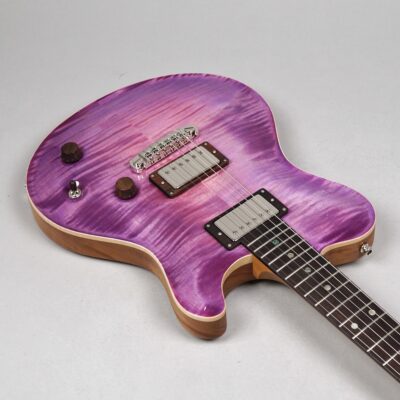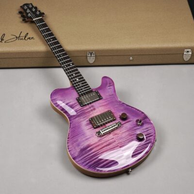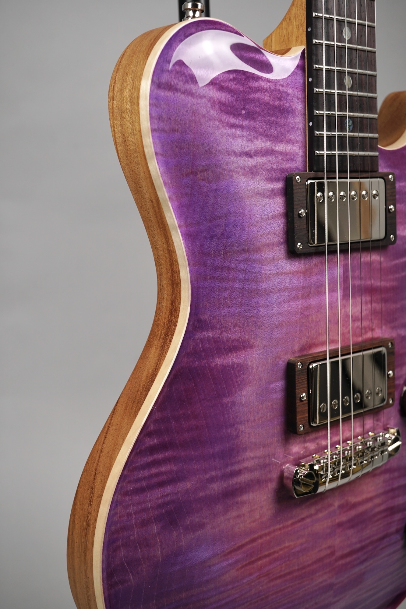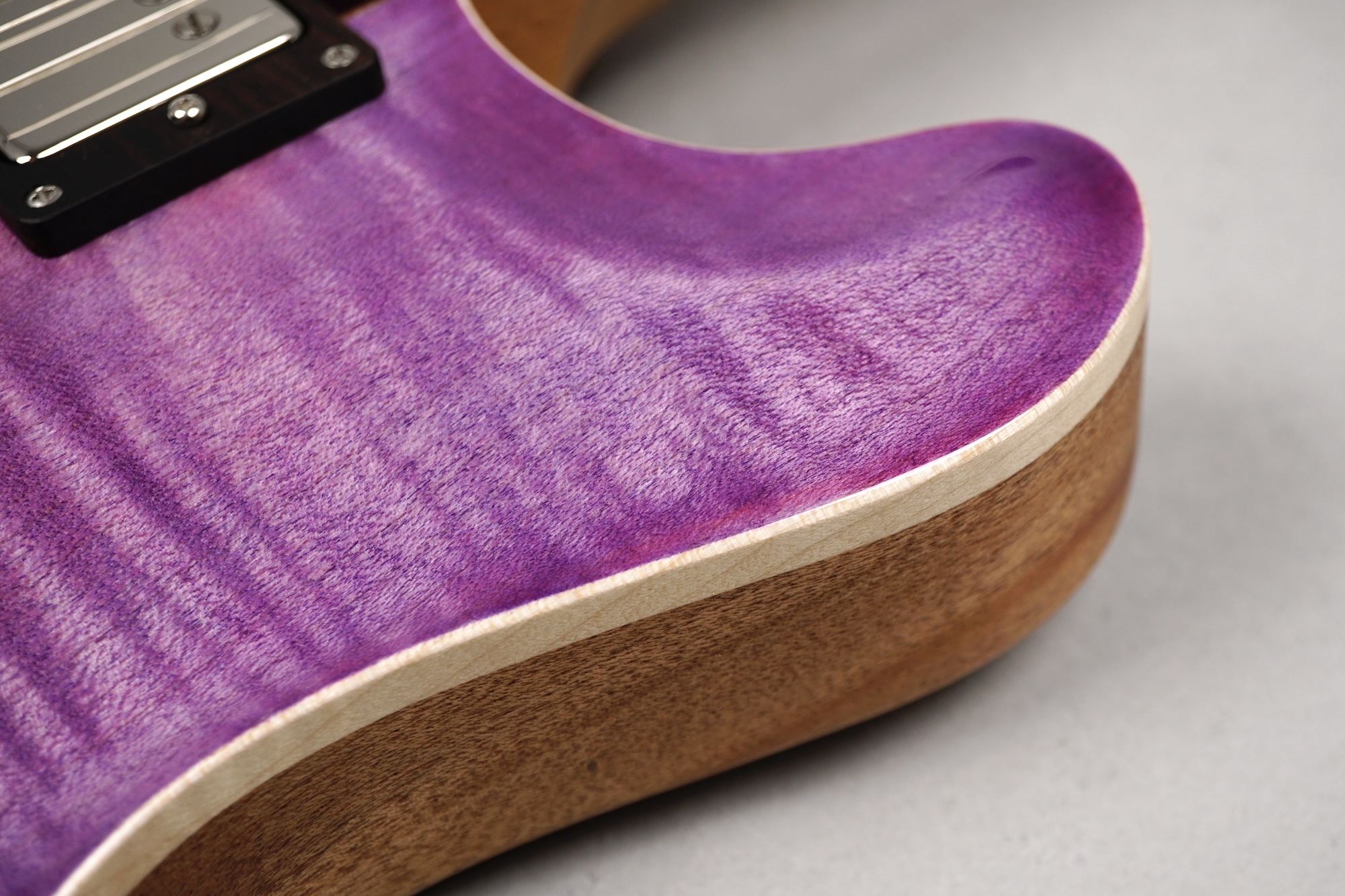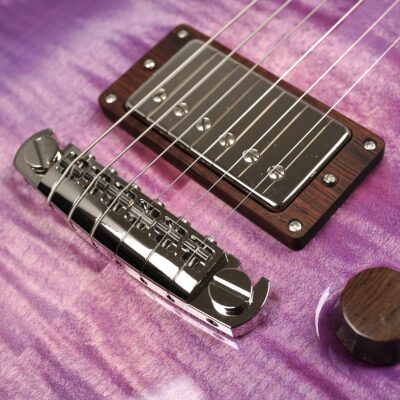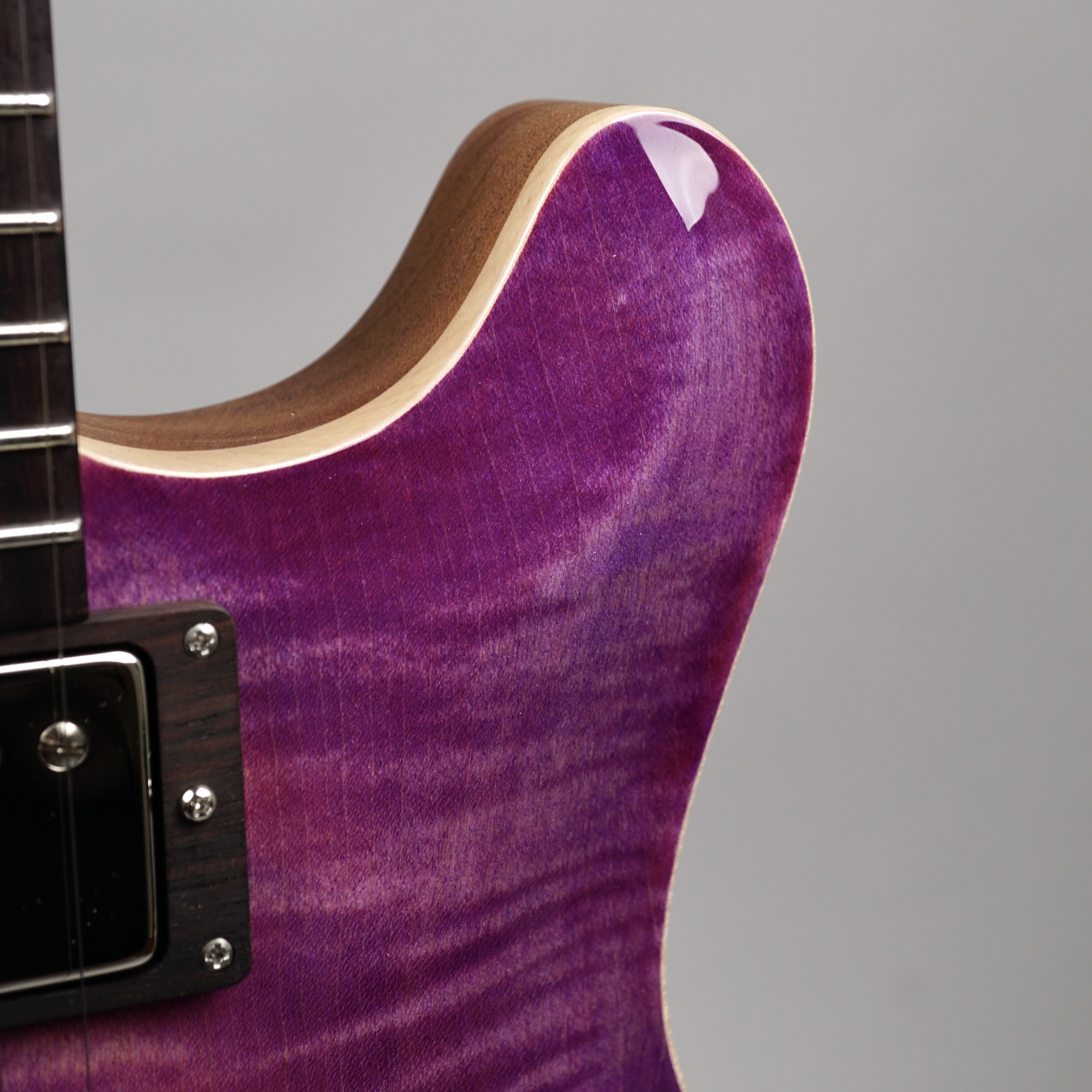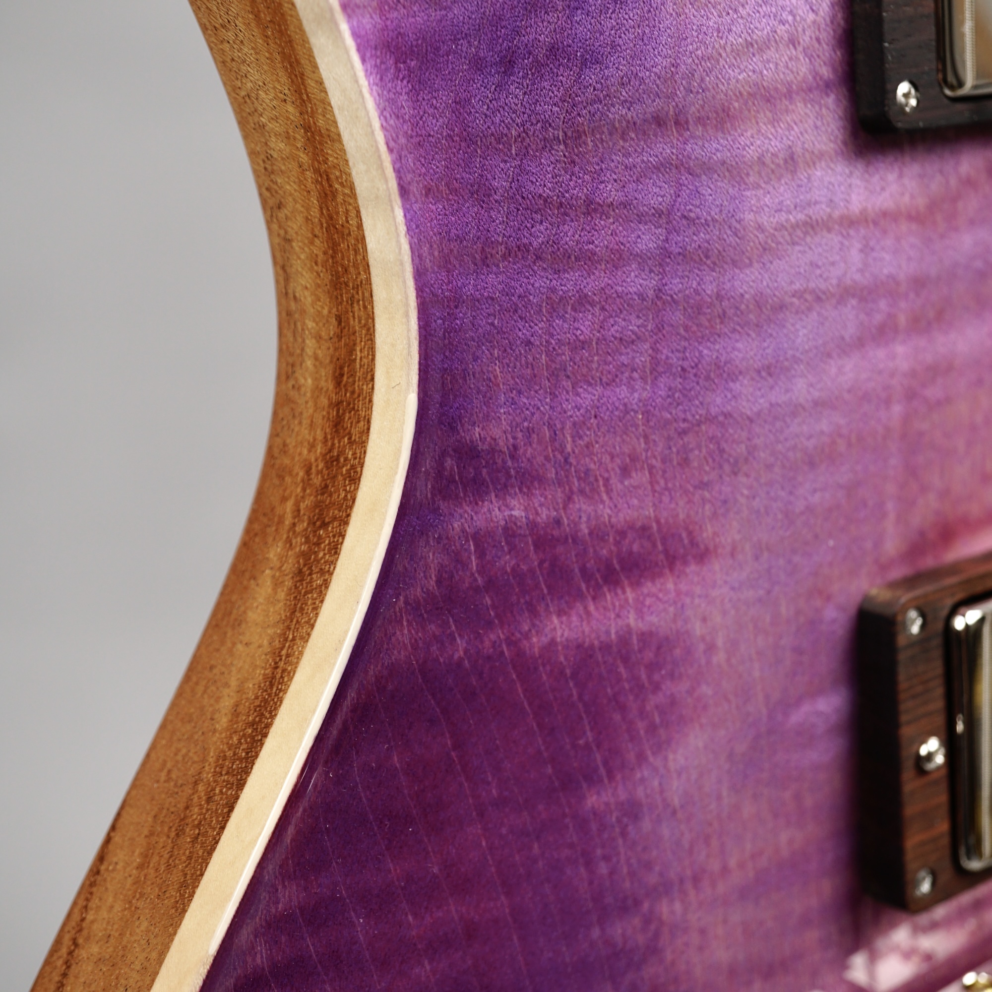 Wenn man den Koffer dieses Exemplars öffnet, ist man zunächst von dem unglaublich intensiven „Purple Burst“ der Maple Decke überwältigt. Deren Maserung kommt durch das High Gloss-Finish optimal zur Geltung, wobei je nach Lichtstärke bzw. -einfall unterschiedliche Farbstufen betont werden. Die an der Seite naturbelassene Decke bildet für dieses tolle „Gemälde“ einen angemessenen Rahmen.
