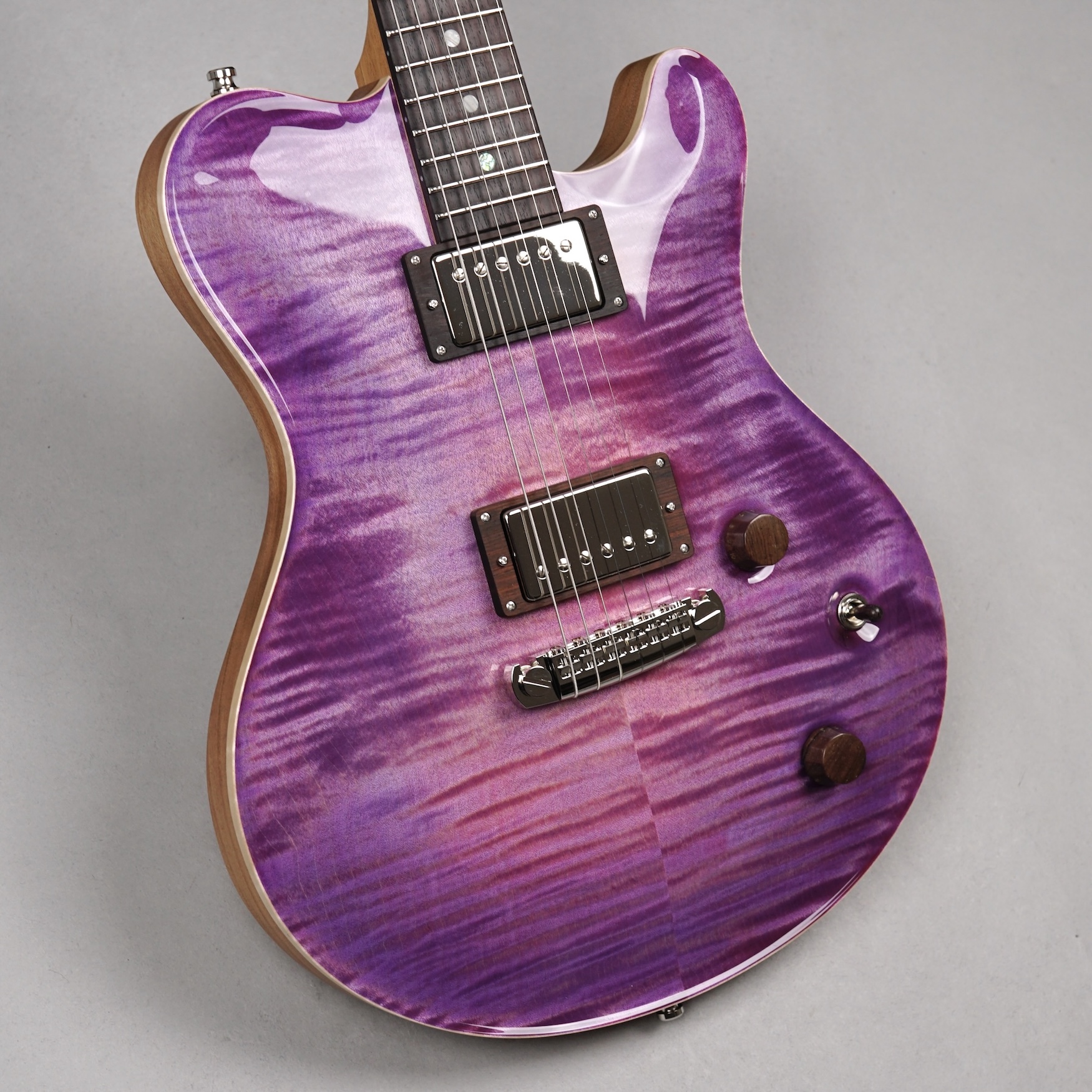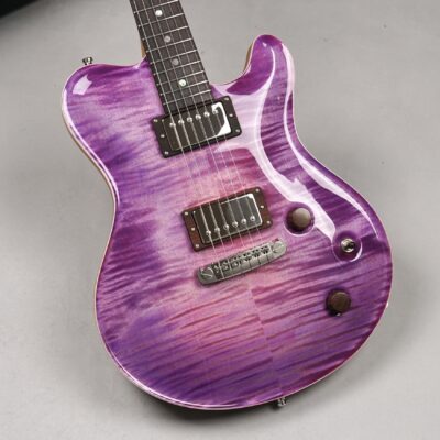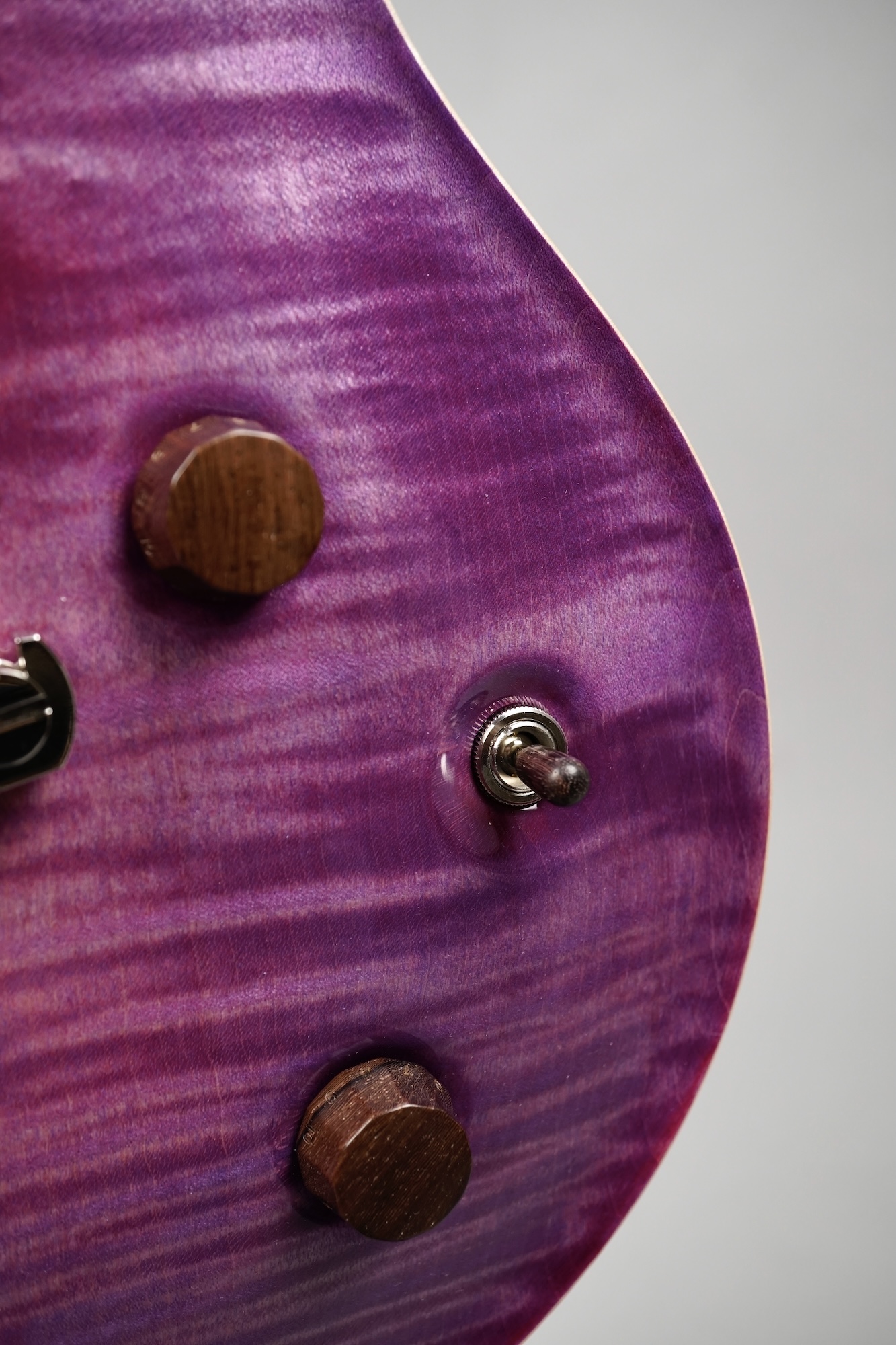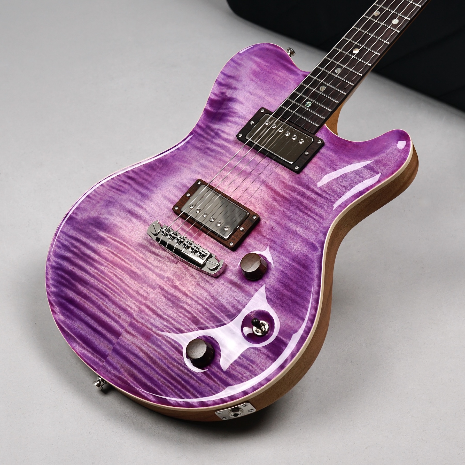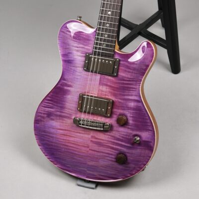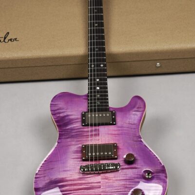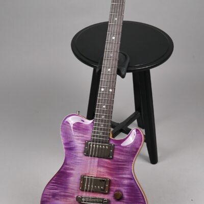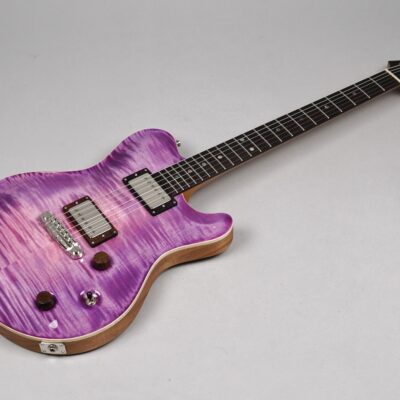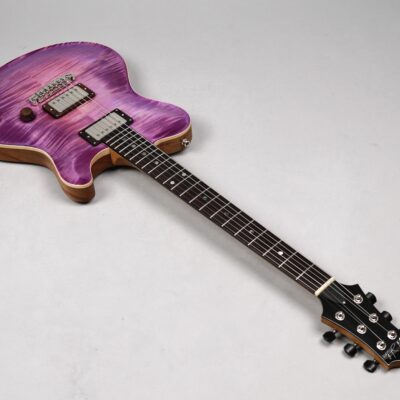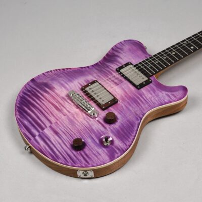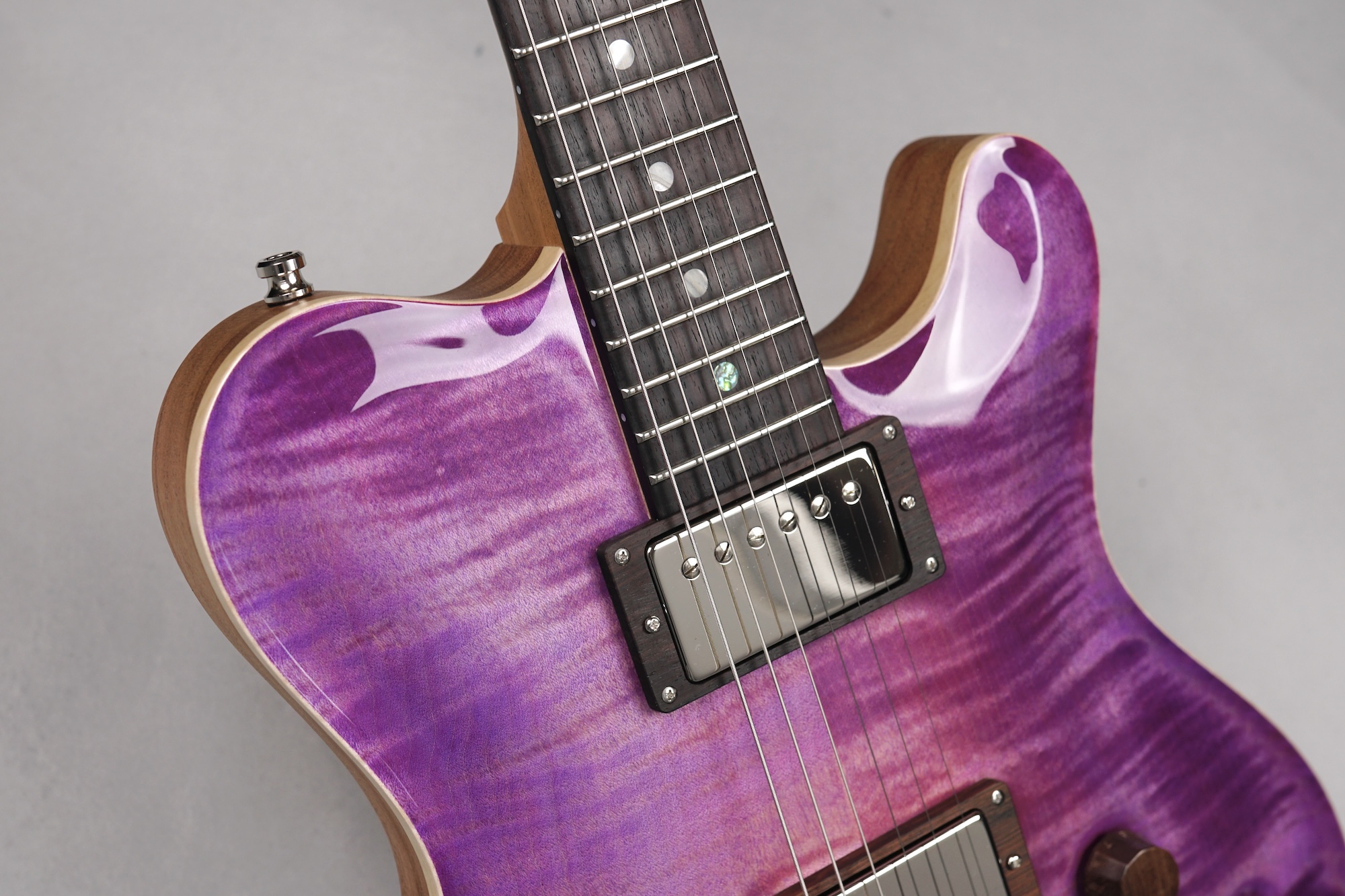 Wenn man den Koffer dieses Exemplars öffnet, ist man zunächst von dem unglaublich intensiven „Purple Burst“ der Maple Decke überwältigt. Deren Maserung kommt durch das High Gloss-Finish optimal zur Geltung, wobei je nach Lichtstärke bzw. -einfall unterschiedliche Farbstufen betont werden. Die an der Seite naturbelassene Decke bildet für dieses tolle „Gemälde“ einen angemessenen Rahmen.