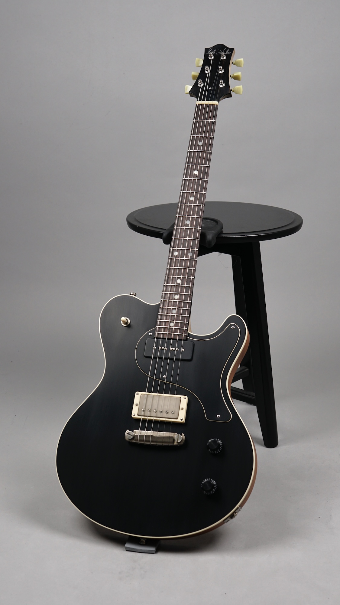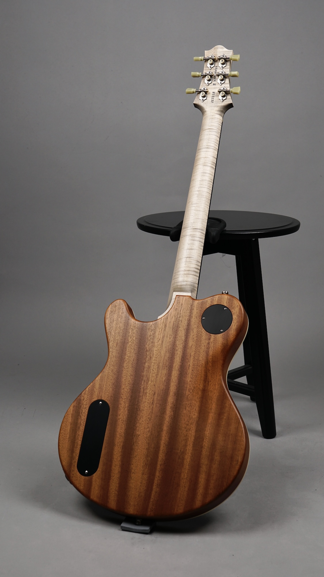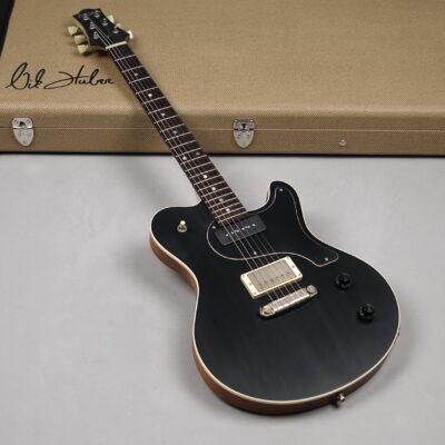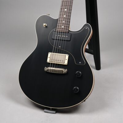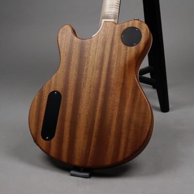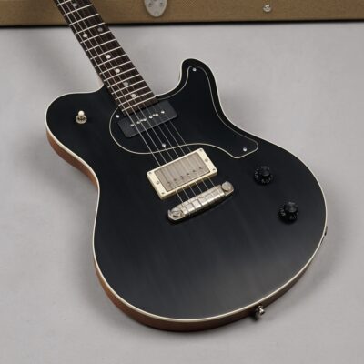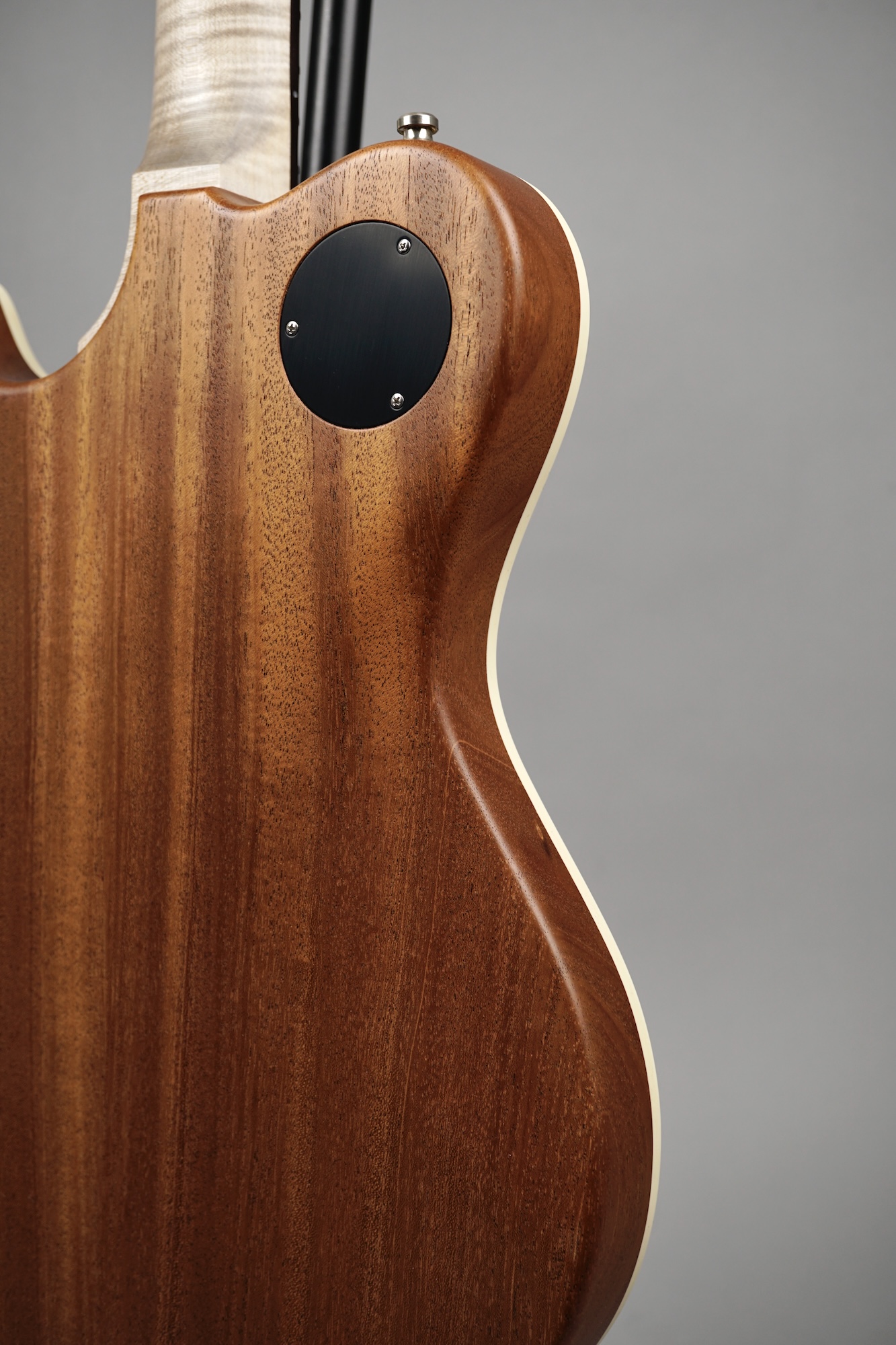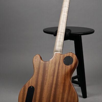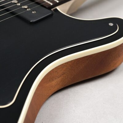 Dieses Prachtexemplar kommt in der klassischen Ausführung: An der Frontseite das edle, mit feinster Stahlwolle aufgeraute „Worn Onyx Black“-Finish – eingerahmt von einem Creme-farbenen Binding – der Rest des wunderschönen Mahogany-Bodys ist wie üblich „Open Pore“.