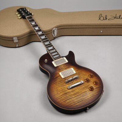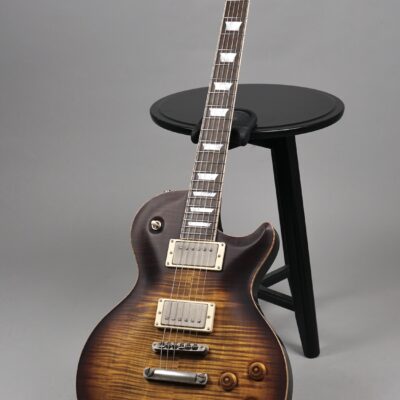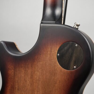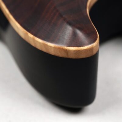Feinste Details wohin man auch schaut: Das sogenannte „Faux“-Binding des einteiligen Mahogany-Bodys lässt den Blick seitlich auf das naturbelassene Flame Maple der Decke frei. Die Signatur des Meisters auf der Kopfplatte ist aus Perlmutt, die Abdeckungen auf der Body-Rückseite sind aus Ebenholz, genau wie das Trussrod-Cover mit dem ins Holz geprägten Modellnamen – all dies trägt seinen Teil zum hochwertigen, absolut stimmigen Gesamteindruck des Instruments bei.