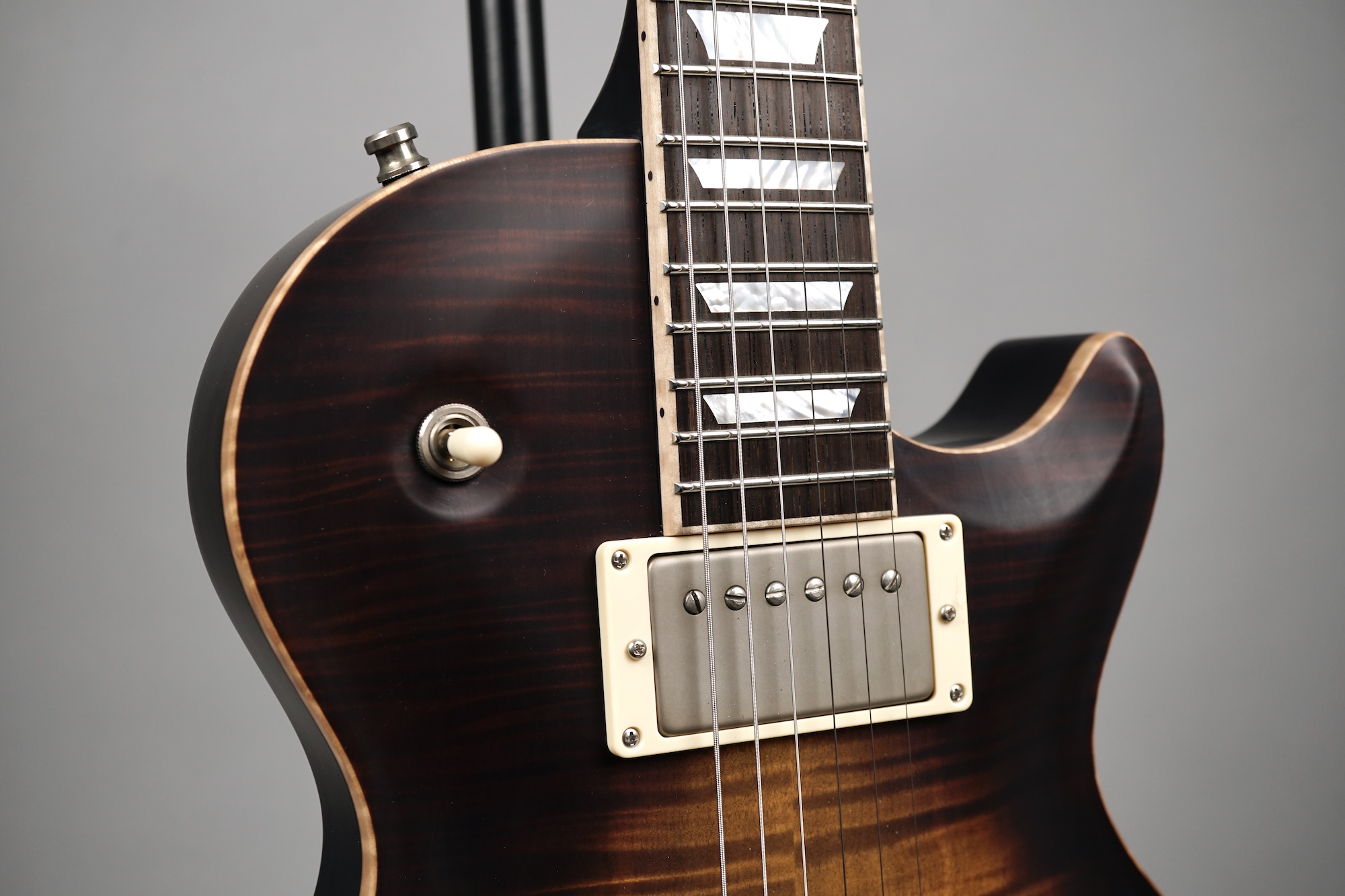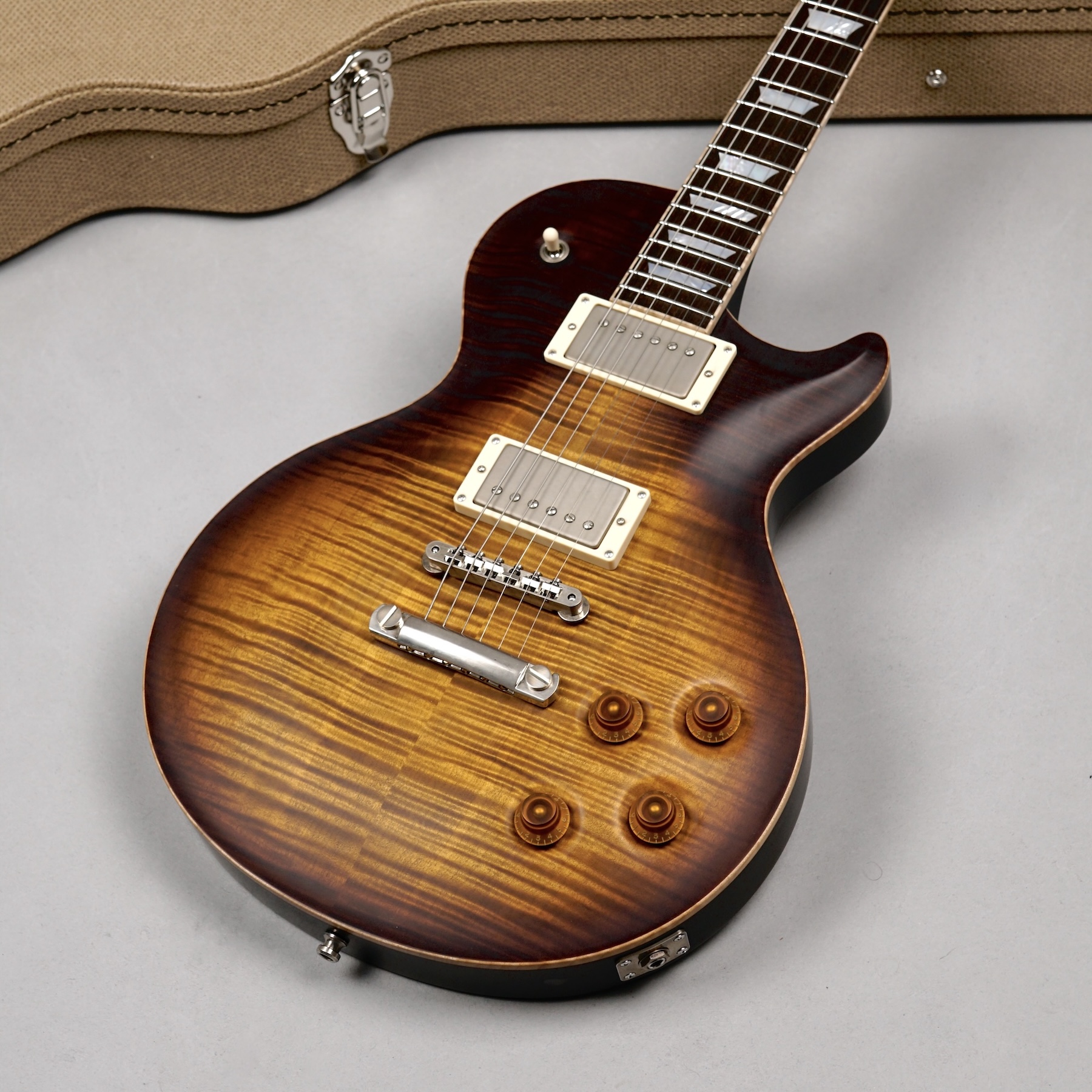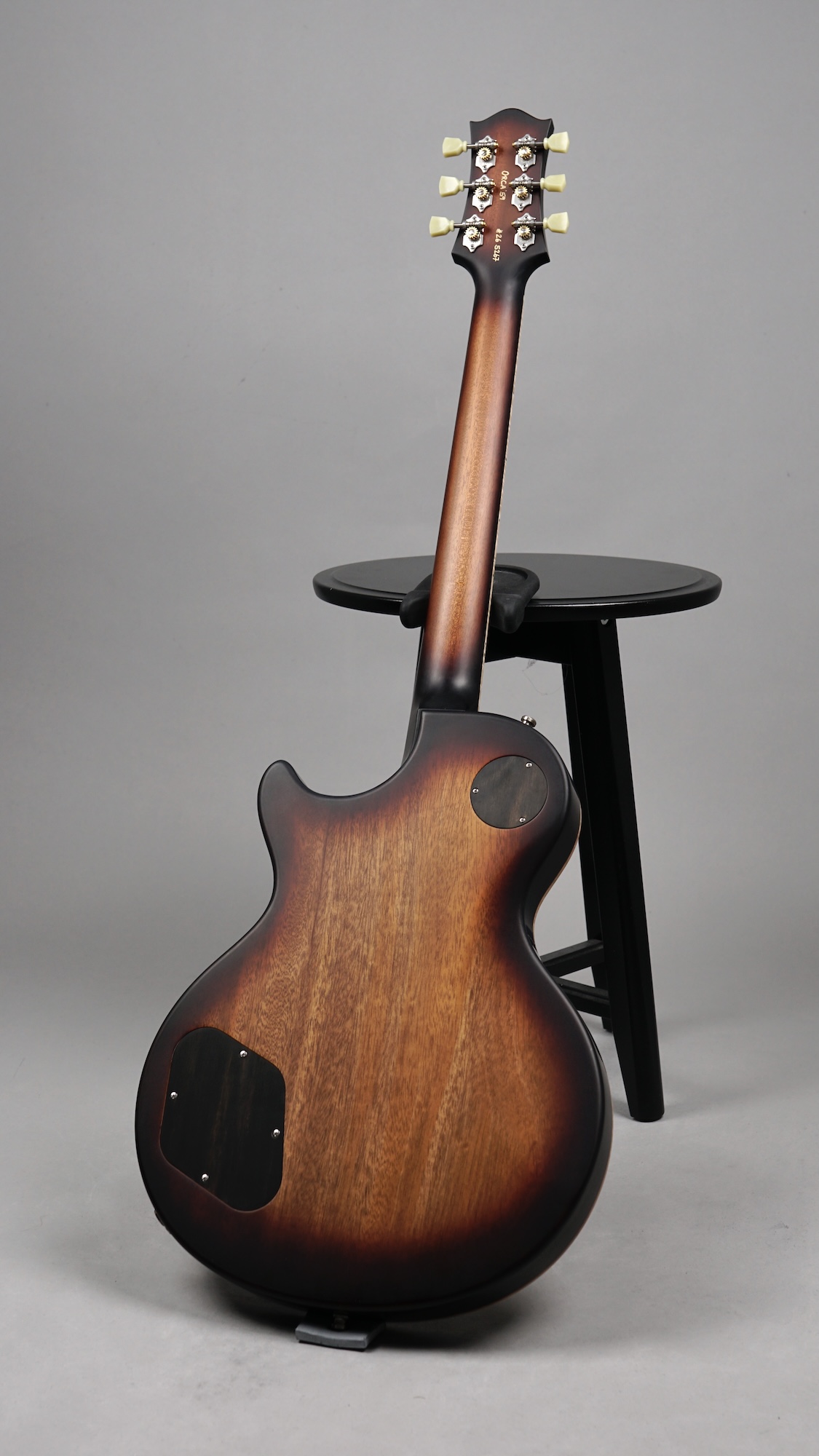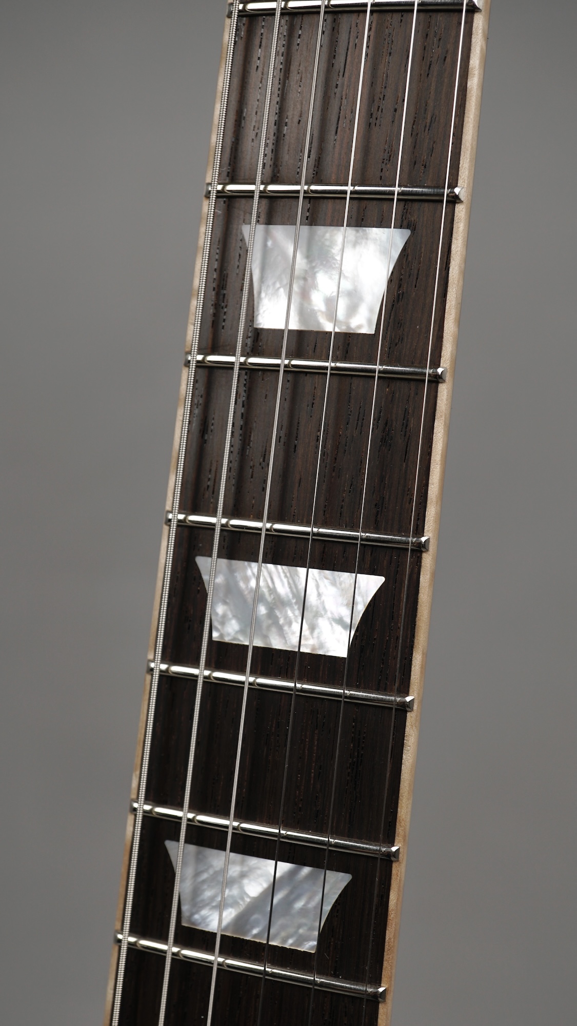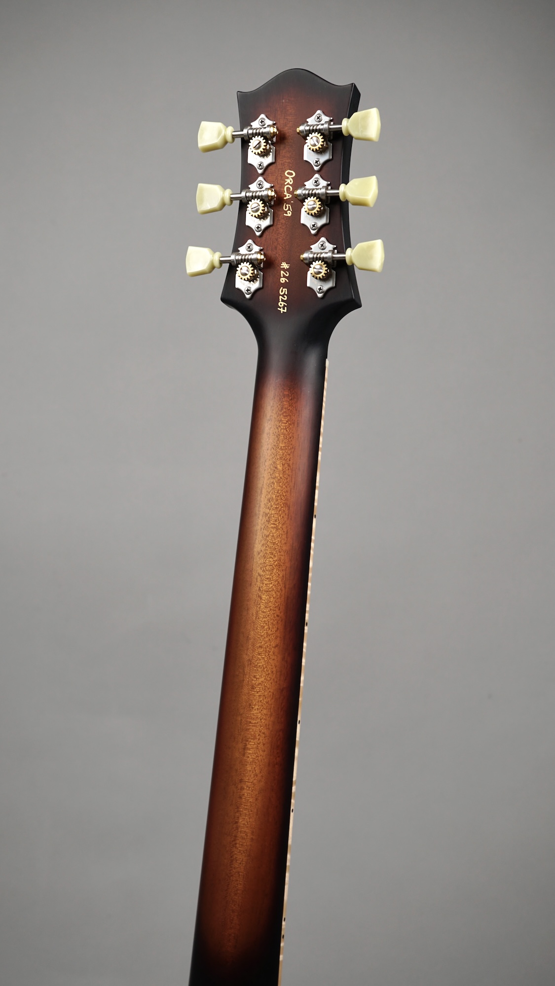 Zum Spielvergnügen trägt auch der Mahogany-Hals mit dem 59er Orca Standard-Shape bei, der wunderbar in der Hand liegt. Das „Brazilian Rosewood“-Griffbrett mit den Mother of Pearl-Crown Inlays ist mit einem perfekt gearbeiteten Flame Maple-Binding eingefasst. Der ergonomische Hals-/Korpus-Übergang ermöglicht eine optimale Bespielbarkeit in den höheren Lagen.
