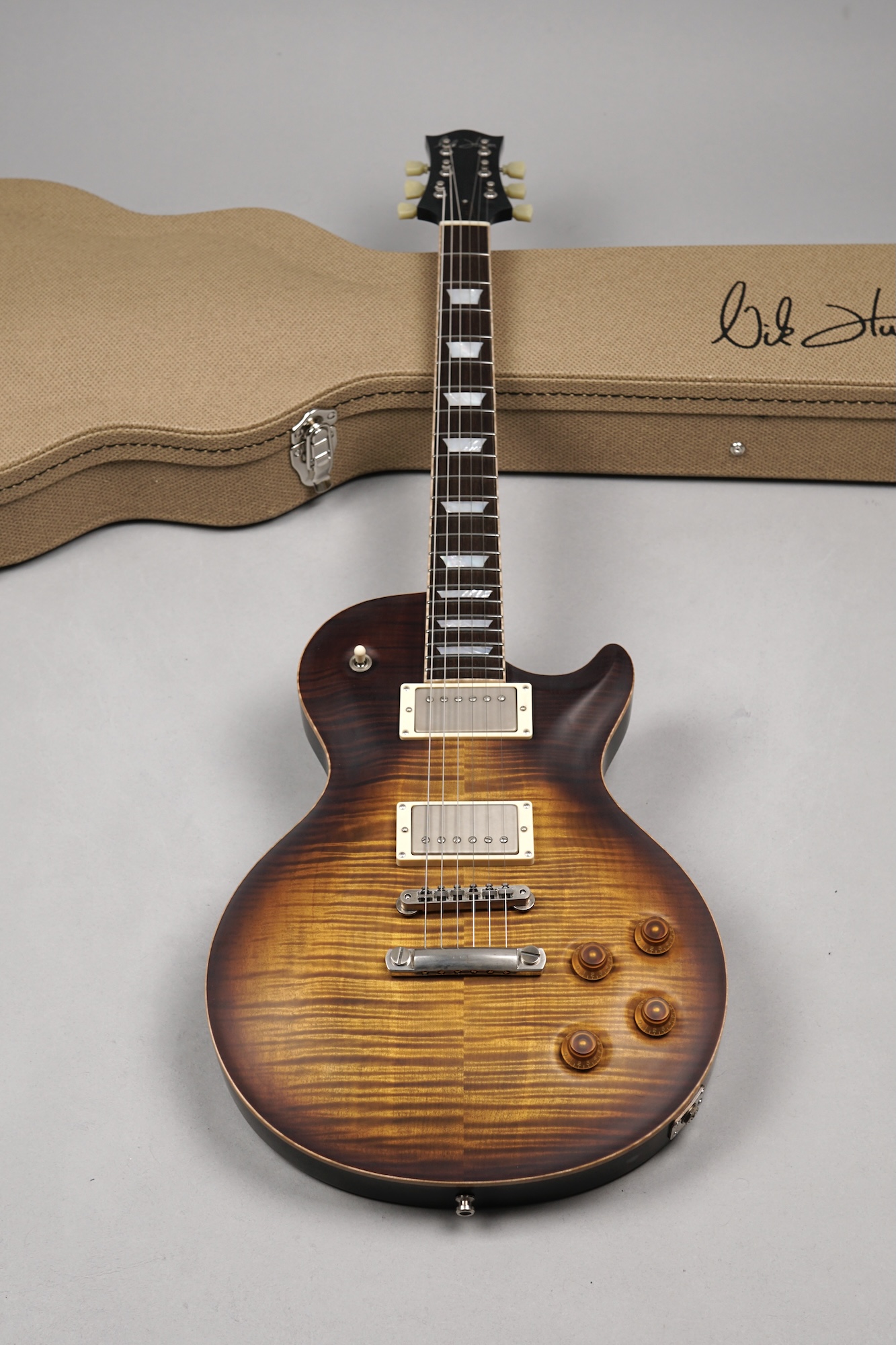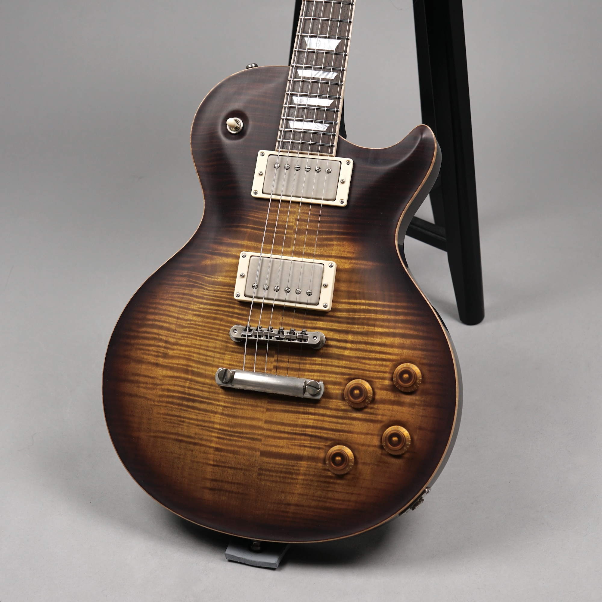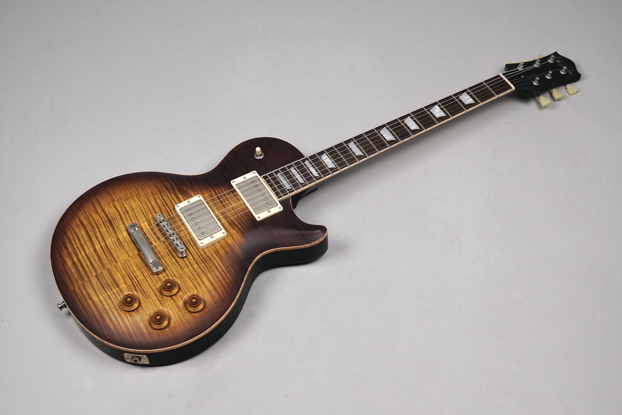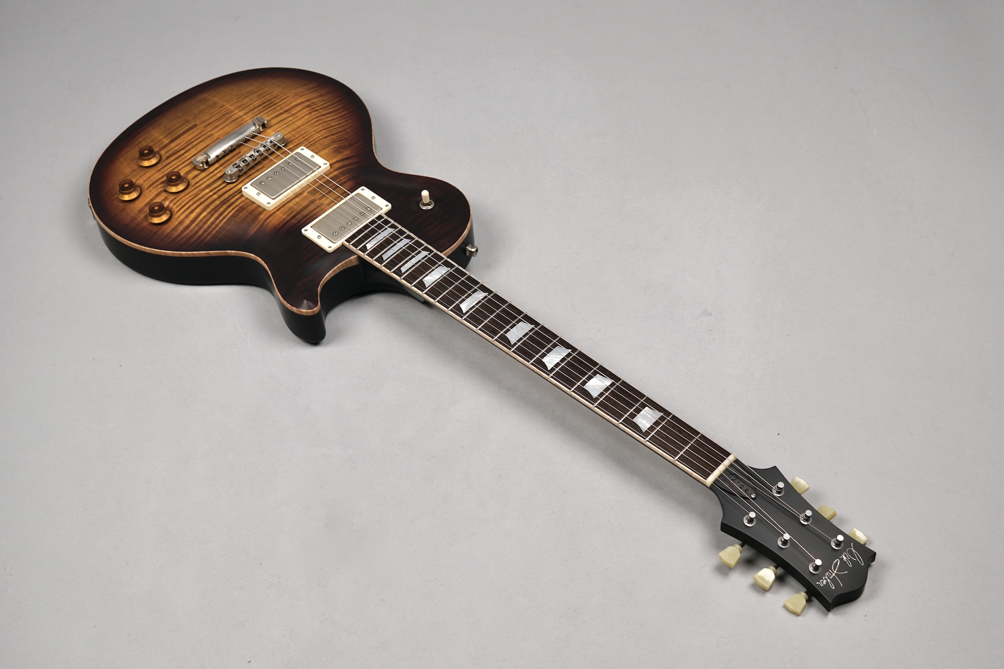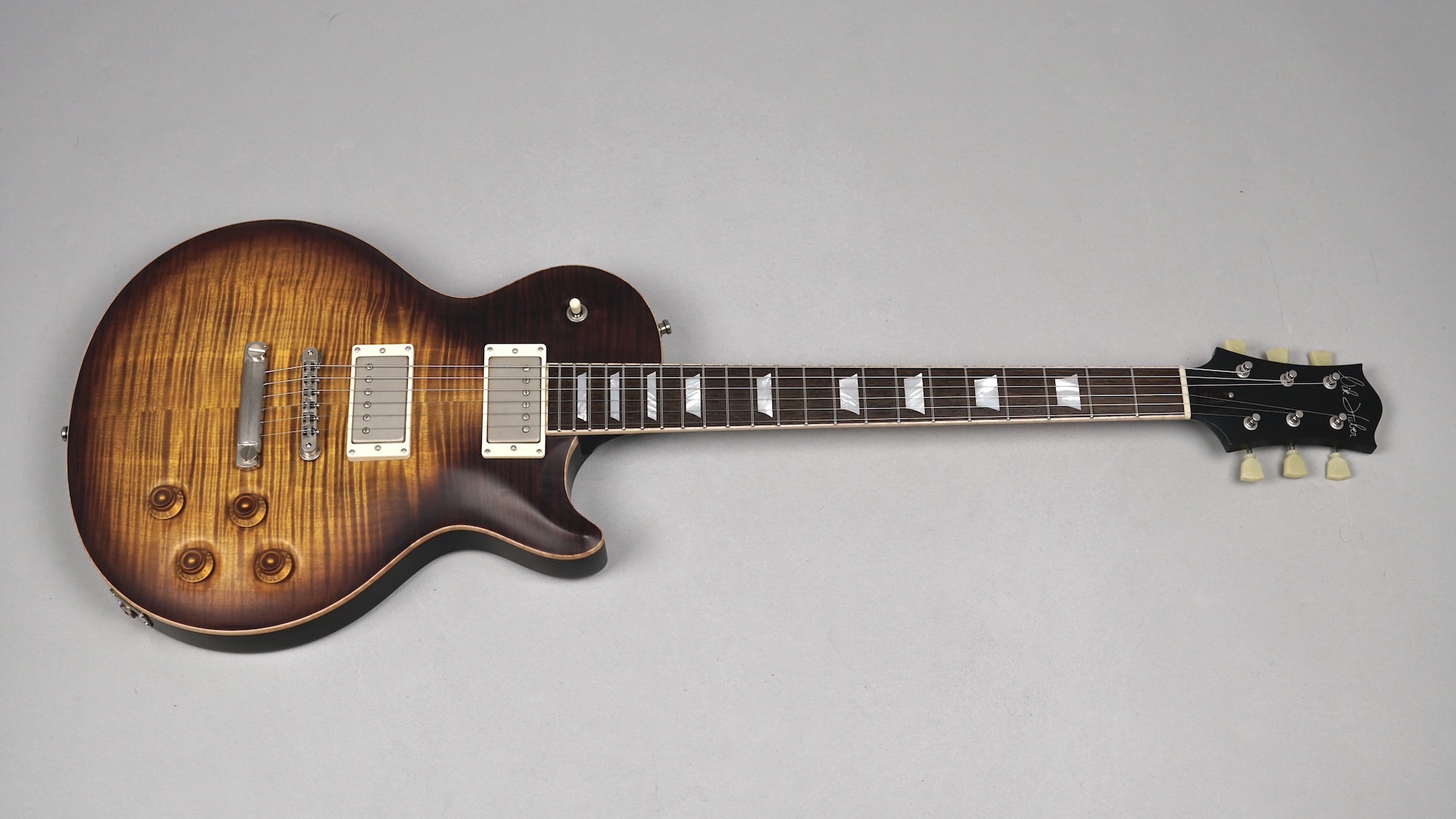 Zum Spielvergnügen trägt auch der Mahogany-Hals mit dem 59er Orca Standard-Shape bei, der wunderbar in der Hand liegt. Das „Brazilian Rosewood“-Griffbrett mit den Mother of Pearl-Crown Inlays ist mit einem perfekt gearbeiteten Flame Maple-Binding eingefasst. Der ergonomische Hals-/Korpus-Übergang ermöglicht eine optimale Bespielbarkeit in den höheren Lagen.
