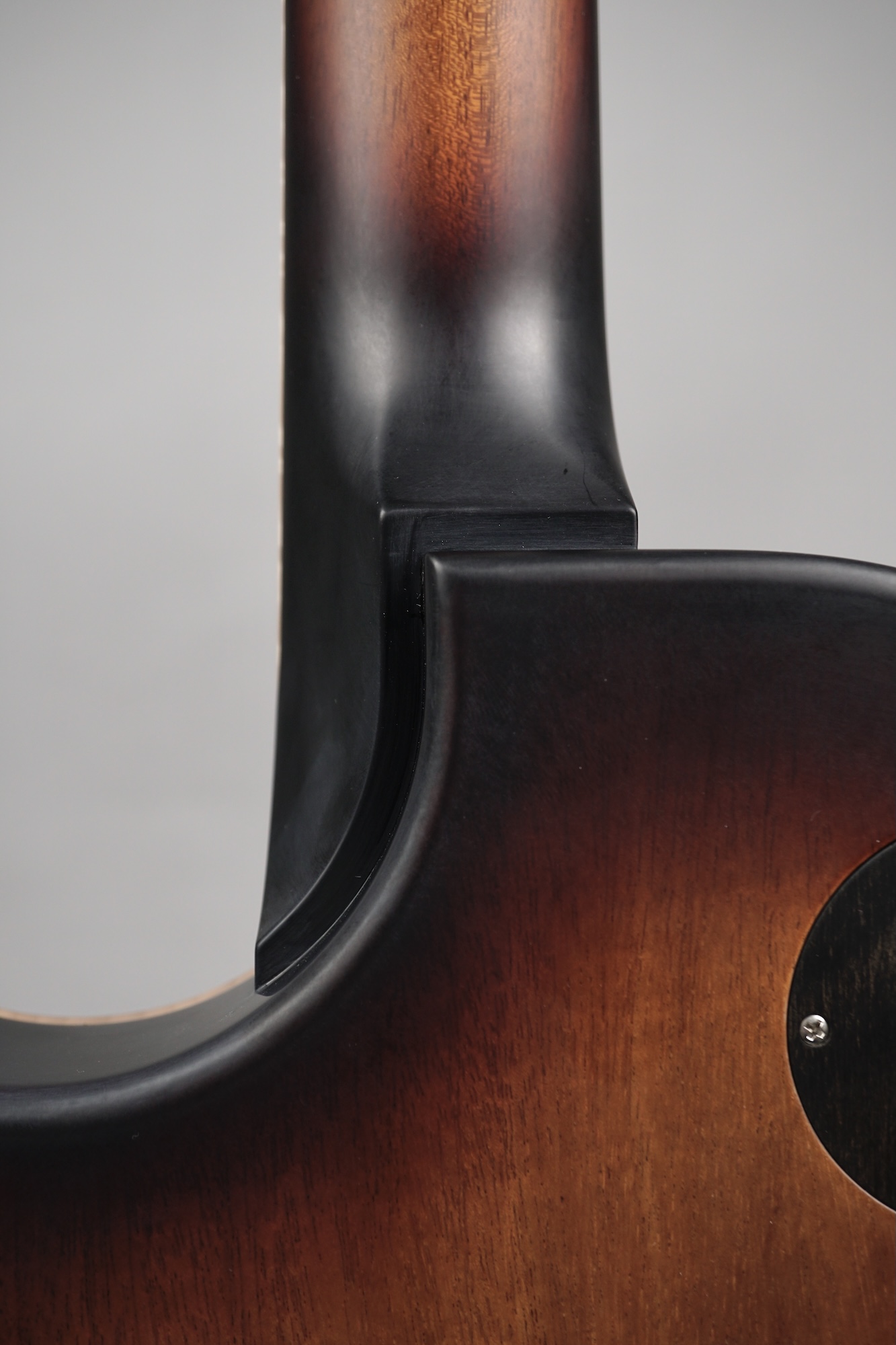 Feinste Details wohin man auch schaut: Das sogenannte „Faux“-Binding des einteiligen Mahogany-Bodys lässt den Blick seitlich auf das naturbelassene Flame Maple der Decke frei. Die Signatur des Meisters auf der Kopfplatte ist aus Perlmutt, die Abdeckungen auf der Body-Rückseite sind aus Ebenholz, genau wie das Trussrod-Cover mit dem ins Holz geprägten Modellnamen – all dies trägt seinen Teil zum hochwertigen, absolut stimmigen Gesamteindruck des Instruments bei.