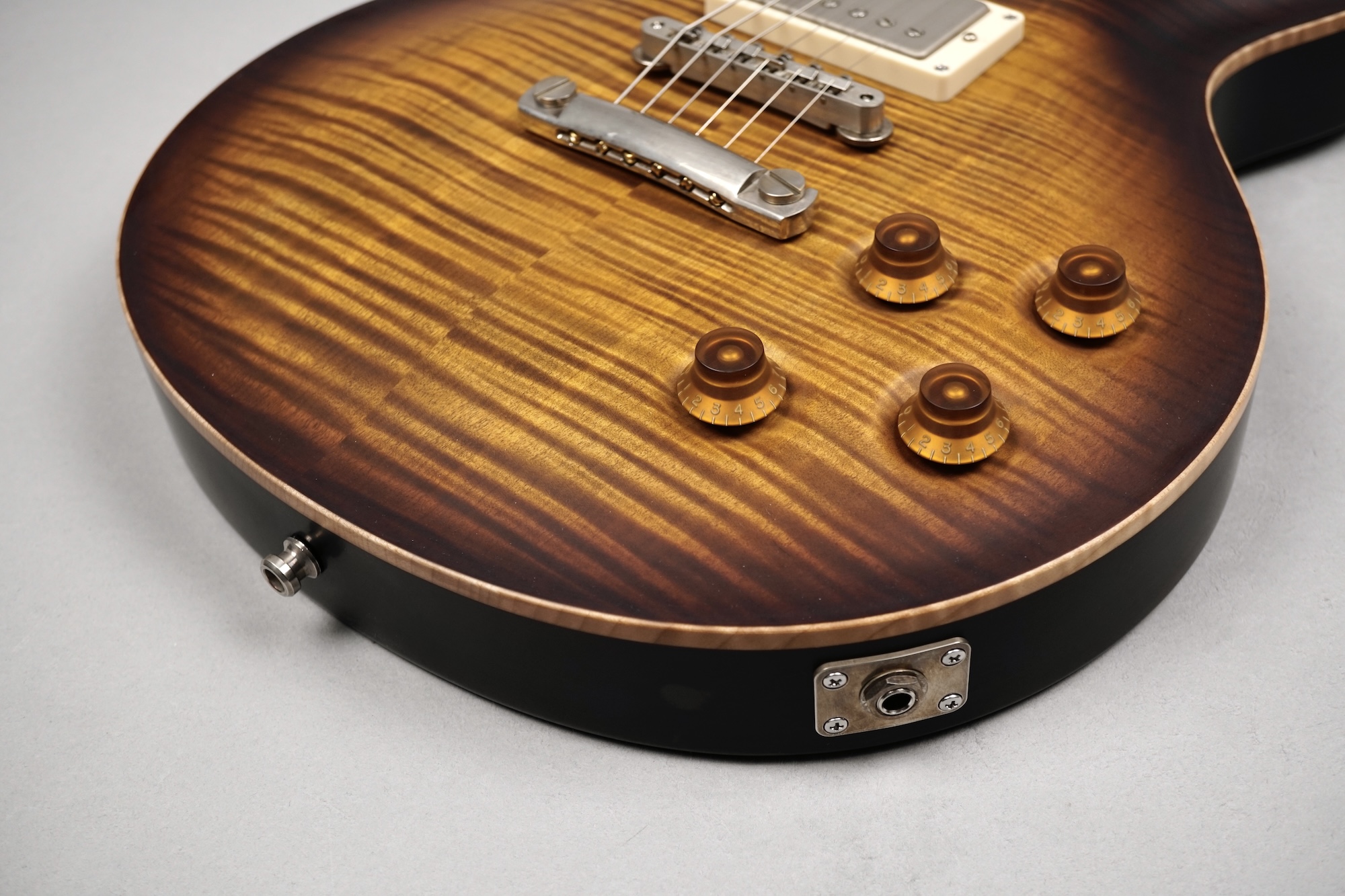 „Exceptional“ – mit diesem Prädikat ist diese „Orca ’59“ in jeglicher Hinsicht angemessen beschrieben: Angefangen bei der „Exceptional Flame Maple“-Decke, die mit einer außergewöhnlich schönen Maserung aufwartet, deren Tiefenwirkung sich aufgrund des Double Stain -Treatments noch verstärkt. Dann das tolle Vintage-Burst auf der Rückseite von Body und Neck.