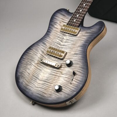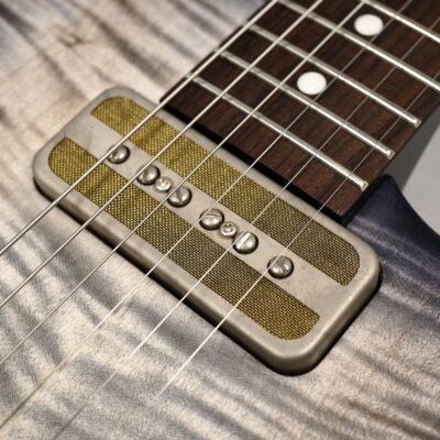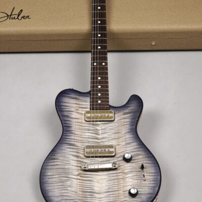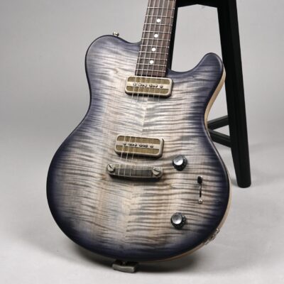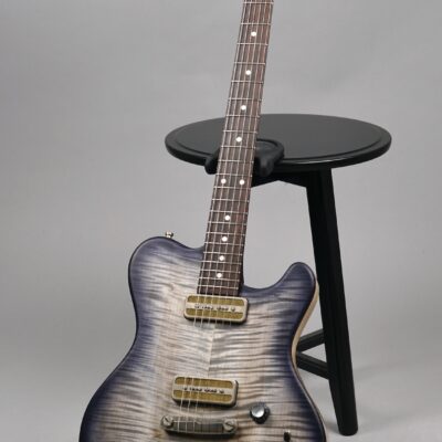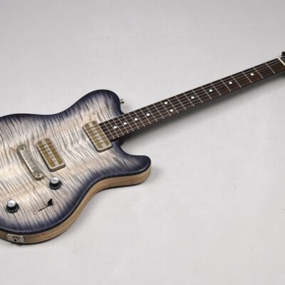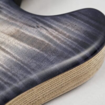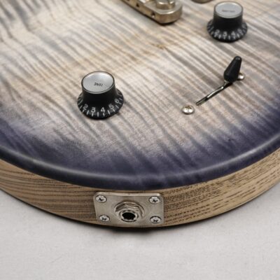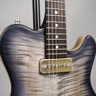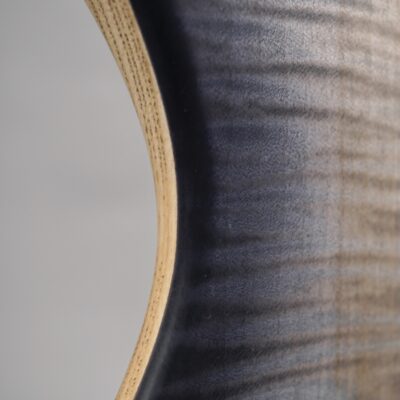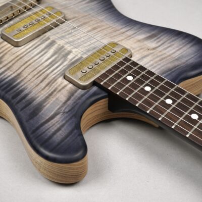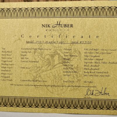 Diese Piet ist eine Premiere – es handelt sich um das allererste Exemplar dieses Modells das mit einer Drop Top kommt! Nik wählte hierfür eine Exceptional Flame Maple-Decke, die den Betrachter mit einem „Custom Blue Burst“-Semi Gloss Finish verzaubert! Das naturfarbene Swamp Ash des Bodys begeistert ebenfalls mit der charakteristischen Maserung dieses Holzes. Kein Wunder, dass diese Gitarre eines der Highlights auf dem Nik Huber-Stand der diesjährigen Guitar Summit war.