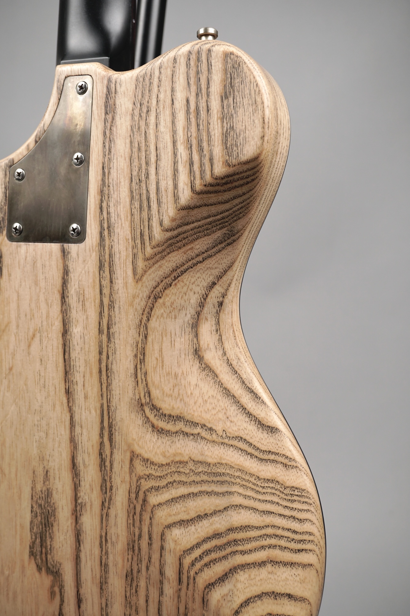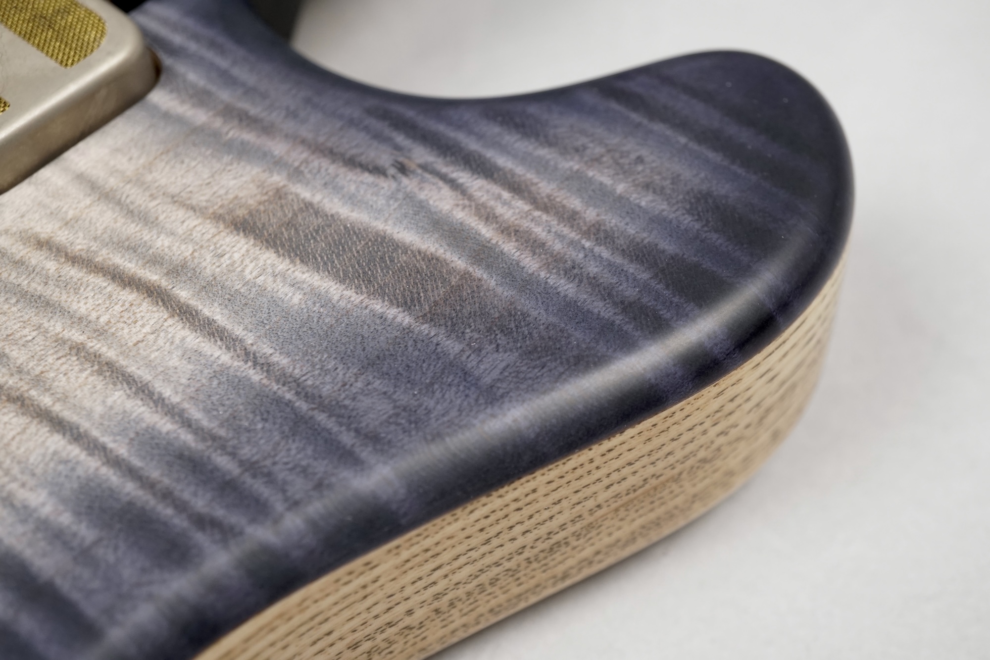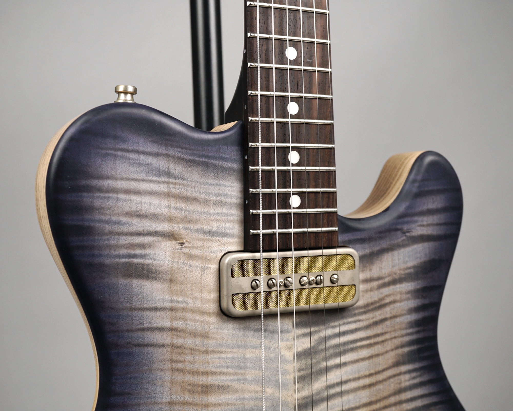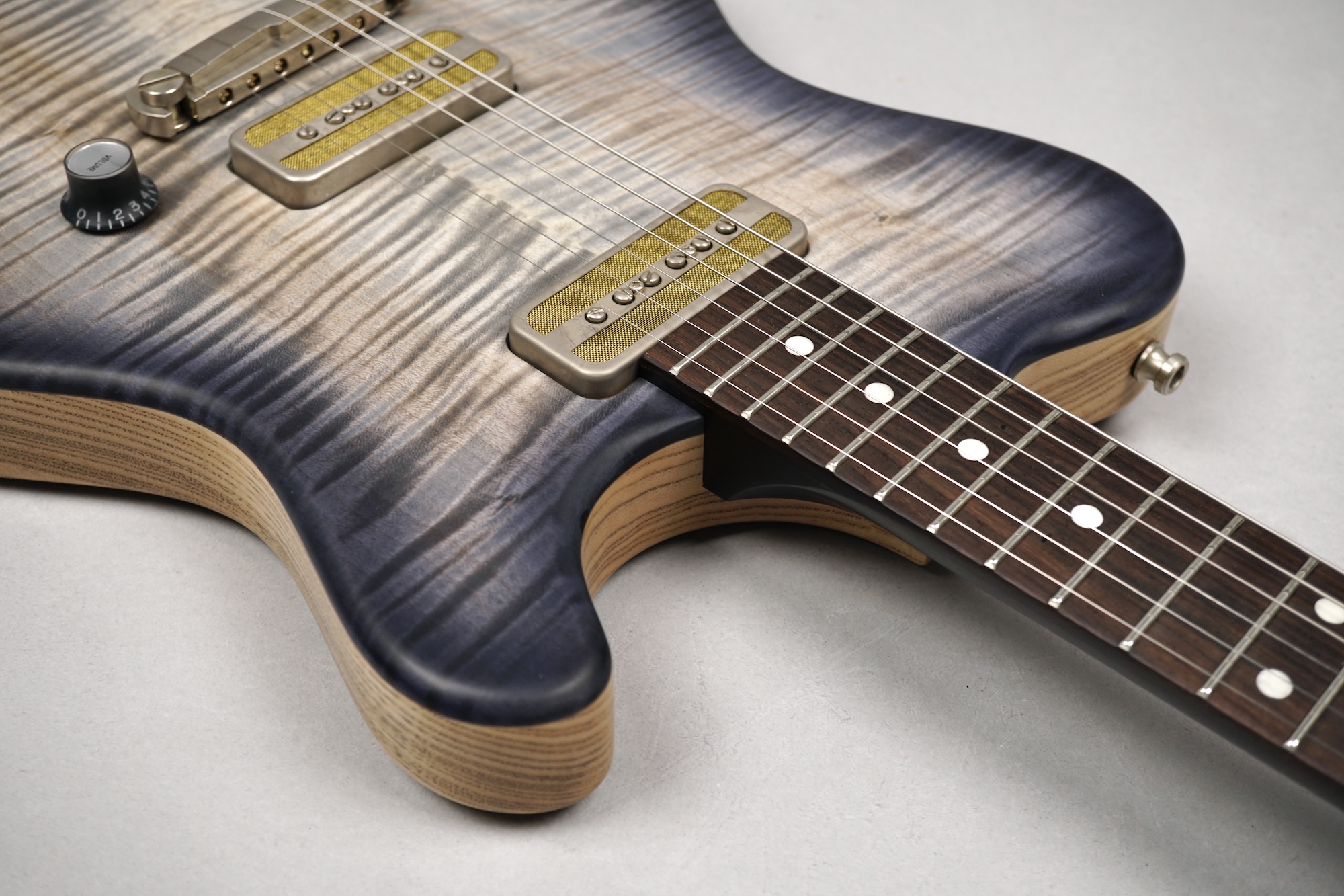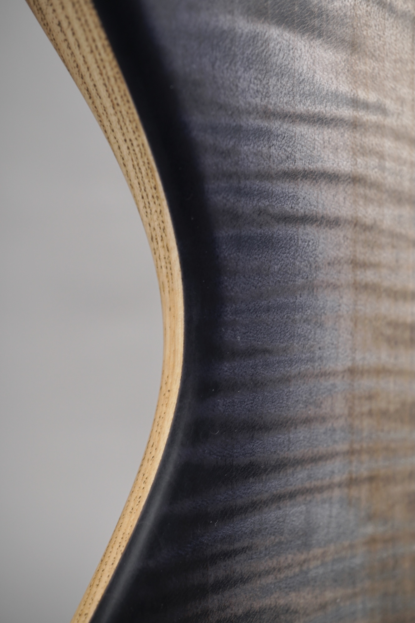 Diese Piet ist eine Premiere – es handelt sich um das allererste Exemplar dieses Modells das mit einer Drop Top kommt! Nik wählte hierfür eine Exceptional Flame Maple-Decke, die den Betrachter mit einem „Custom Blue Burst“-Semi Gloss Finish verzaubert! Das naturfarbene Swamp Ash des Bodys begeistert ebenfalls mit der charakteristischen Maserung dieses Holzes. Kein Wunder, dass diese Gitarre eines der Highlights auf dem Nik Huber-Stand der diesjährigen Guitar Summit war.