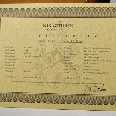 Trotz der charmanten „Indie Rock“-Attitude ist die „Piet“ ohne Frage eine echte Nik Huber Gitarre: Die in jeglicher Hinsicht perfekte Machart, die gelungene Formgebung & Haptik, die angenehme Bespielbarkeit sowie Details wie das gebürstete Tortoise von Pickguard, E-Fach Backplate und Trussrod-Cover.