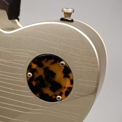 Die Rückseite des Korpus -mit Belly-Cut- ist aus einem Stück Swamp Ash, welches mit der patinierten Shoreline Gold-Nitro Lackierung einen großartigen Kontrast zur natürlichen Anmutung des Indian Rosewood bietet. Dies gilt auch für die fette Lage Celluloid aus dem das elegante Pickguard und die beiden Backplates gekonnt herausgeschnitten wurden.